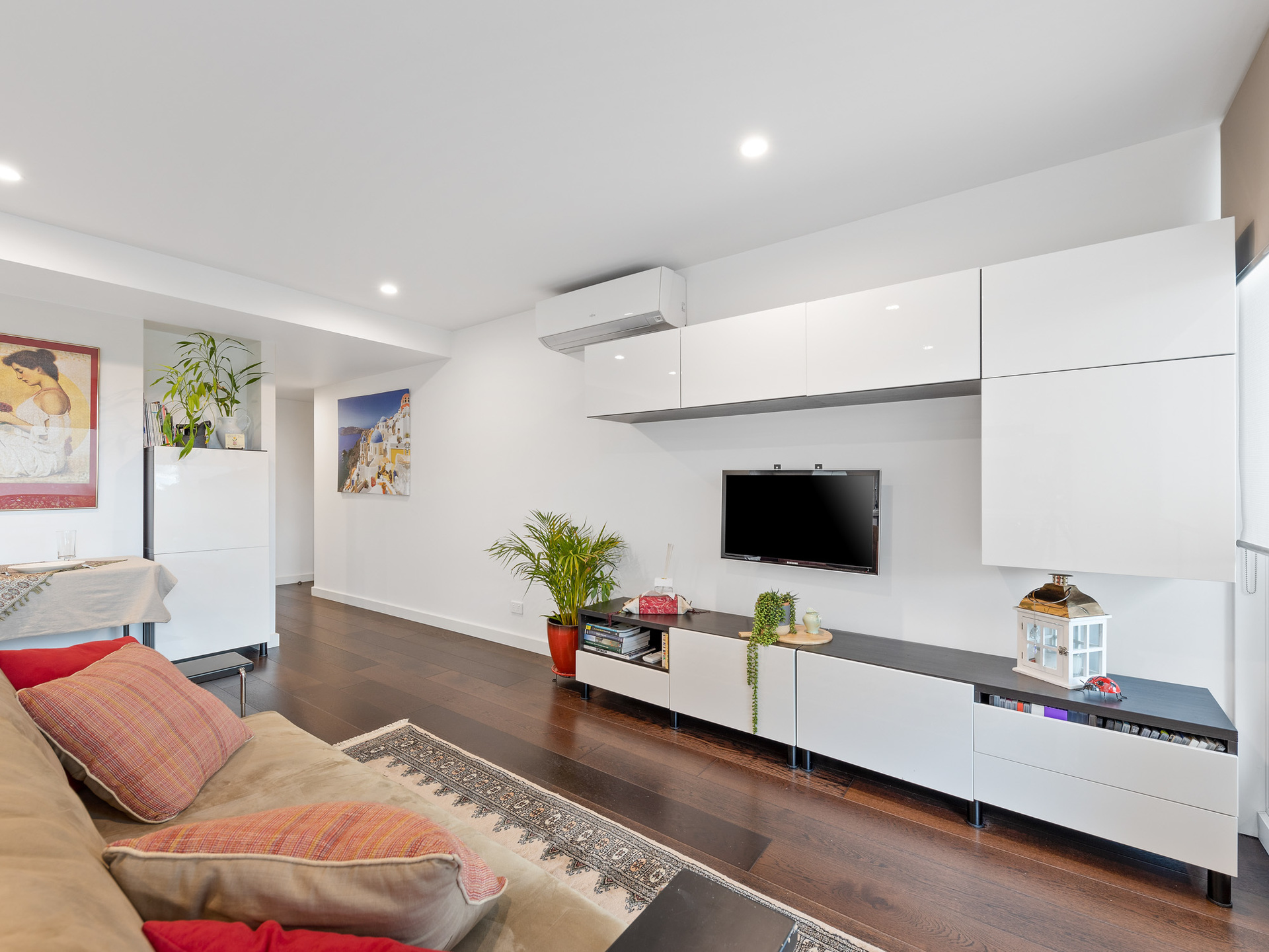 With north-facing private balcony, a light filled open-plan living area lined with a beautiful Oak floor leading to a relaxing master bedroom, where you find a study area and fully fitted walk-in wardrobe. The modern bathroom has a large shower. The secure undercover car park space and the storage cage are conveniently located. All windows are double-glazed and the split system air-conditioner offers increased comfort.
