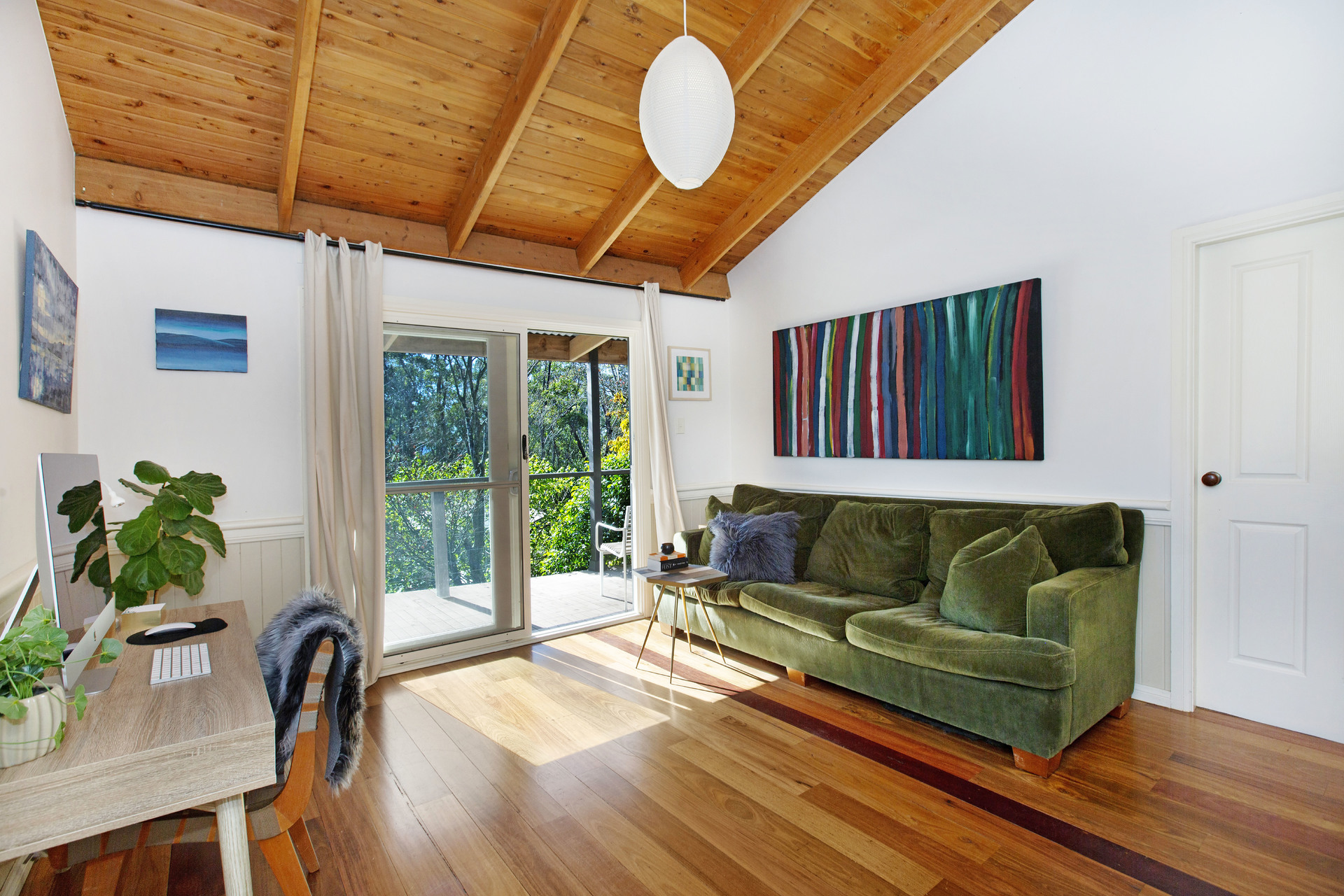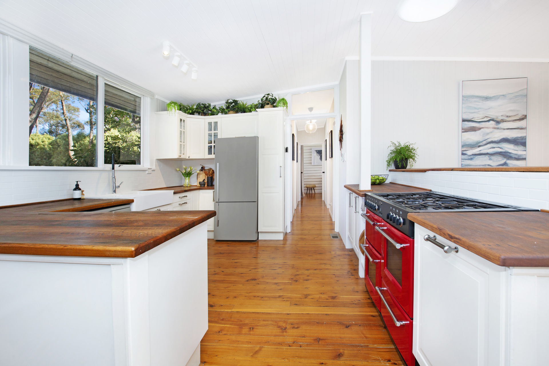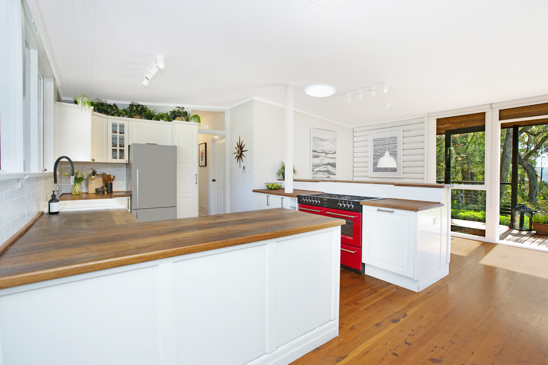 Situated in the garden are 2 insulated and lined studio/workshop spaces ideal for guests, teenagers or creative pursuits. Other features include ducted gas heating, slow combustion wood heater. The kitchen is fitted with an imported 110cm Belling range cooker, recycled hardwood bench tops and butlers sink.