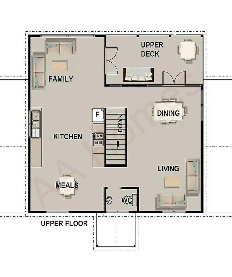 First Floor: Open Plan Kitchen, Family, Dining, Living, Powder Room & 10m² covered Balcony.