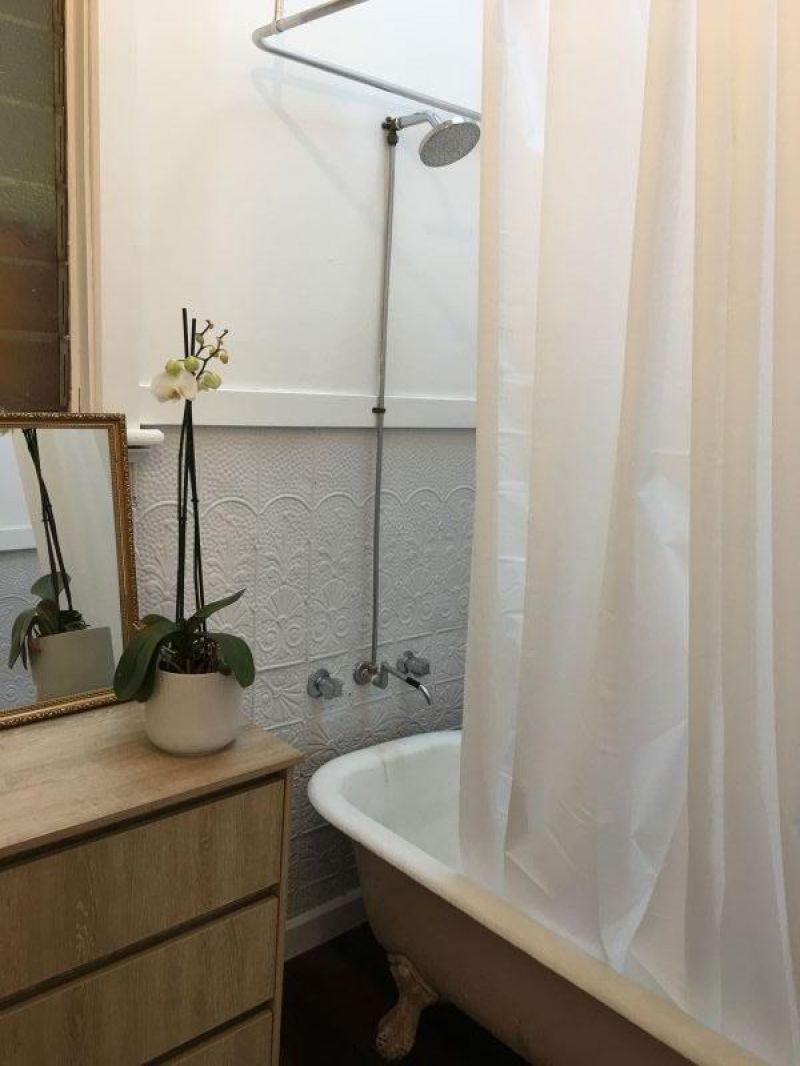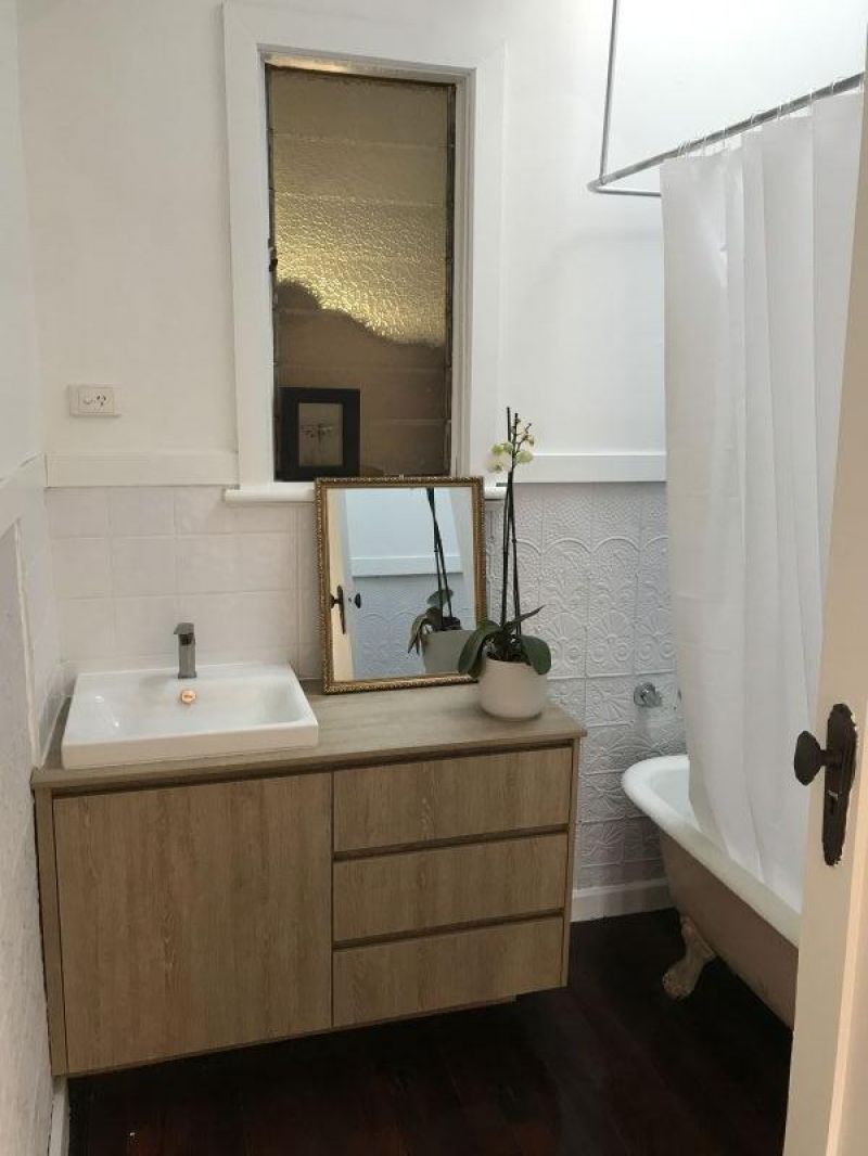 The bathroom features an original, enamel, claw foot bath. The cabinetry and sink are new and feature lots of storage and clean practicality.