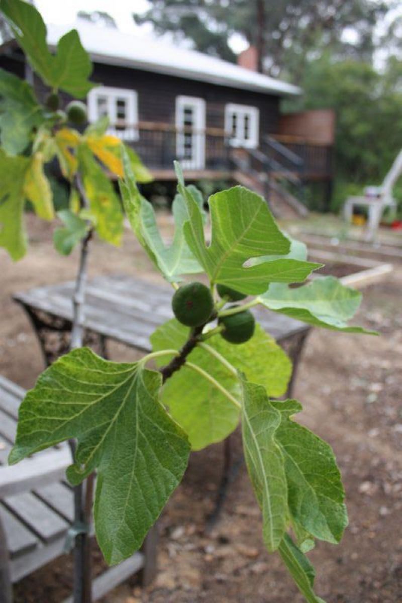 The garden features mature native trees. Fruit trees and native bushes/flowers have been planted in the structured beds. The fruit includes plum, peach, fig, passionfruit, orange, olive.