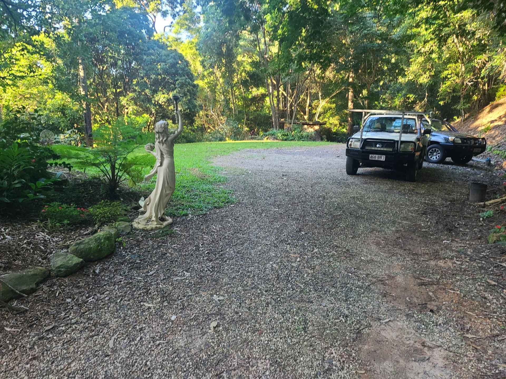 Located at the end of 100m prestige street of 10 acreage homes. No through visible traffic or houses to overlook, just beautiful open views overlooking gardens and rainforest mountains. The slight elevation captures good breezes, not stifling in summer. The building envelope is set back 60m from the main road with established landscaped gardens that can be costly and take years to establish.