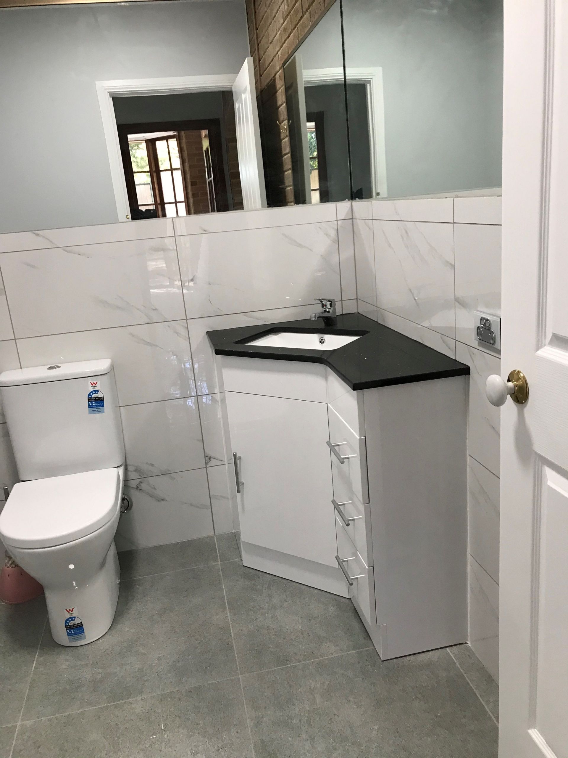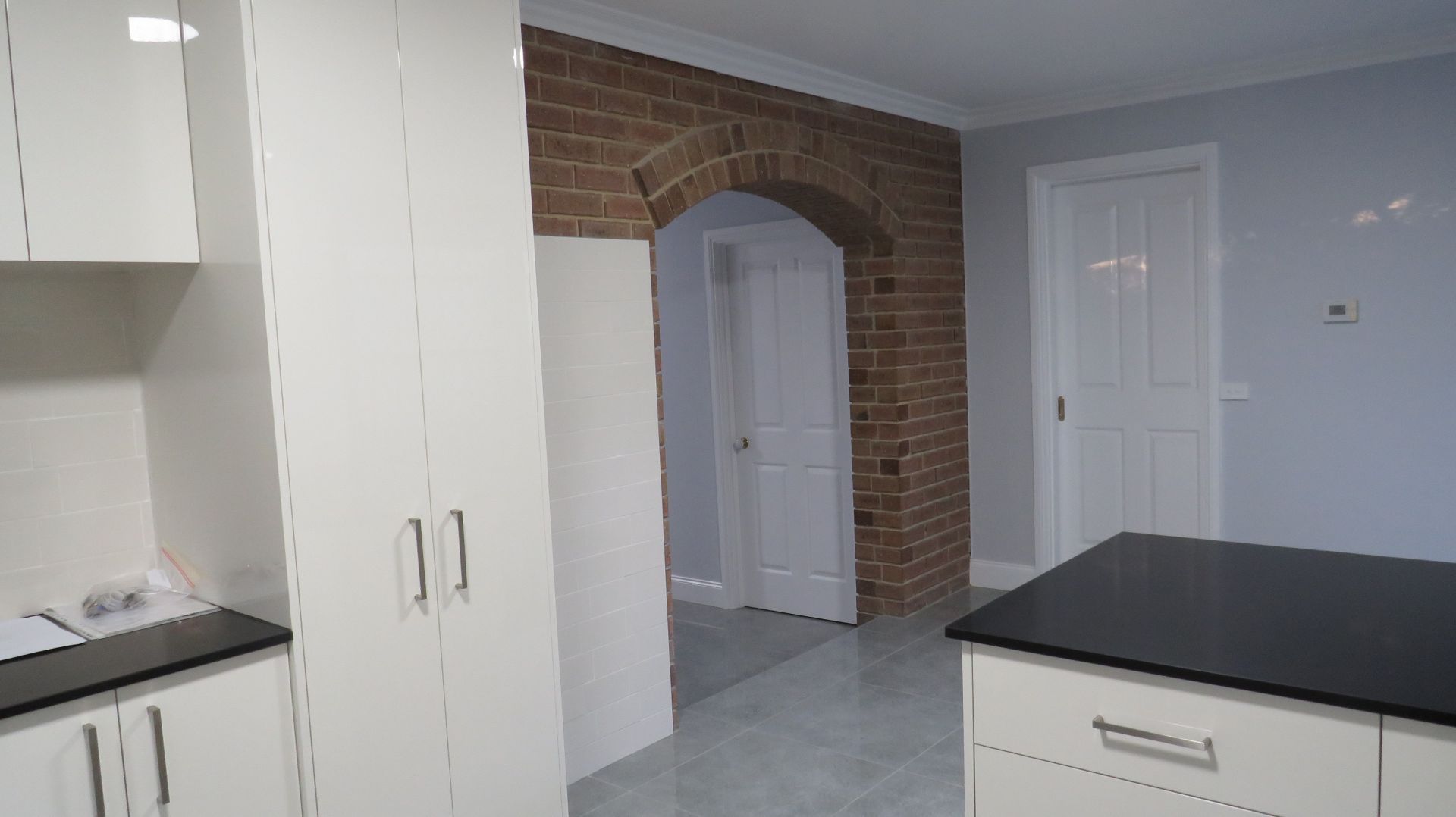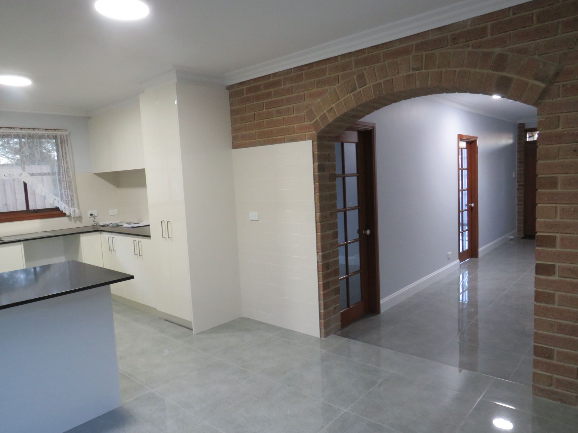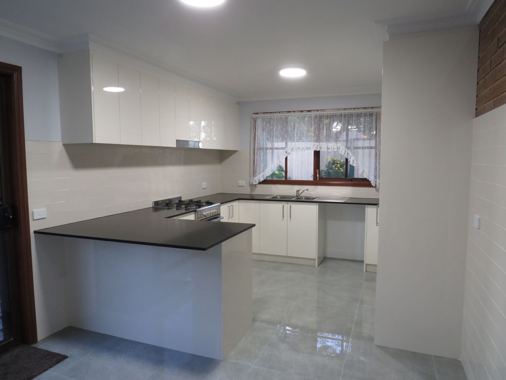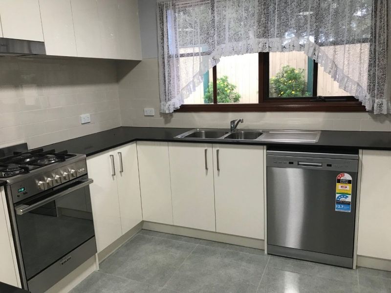 The new kitchen has a two pac finish with stone style bench tops, freestanding gas stove and dishwasher.