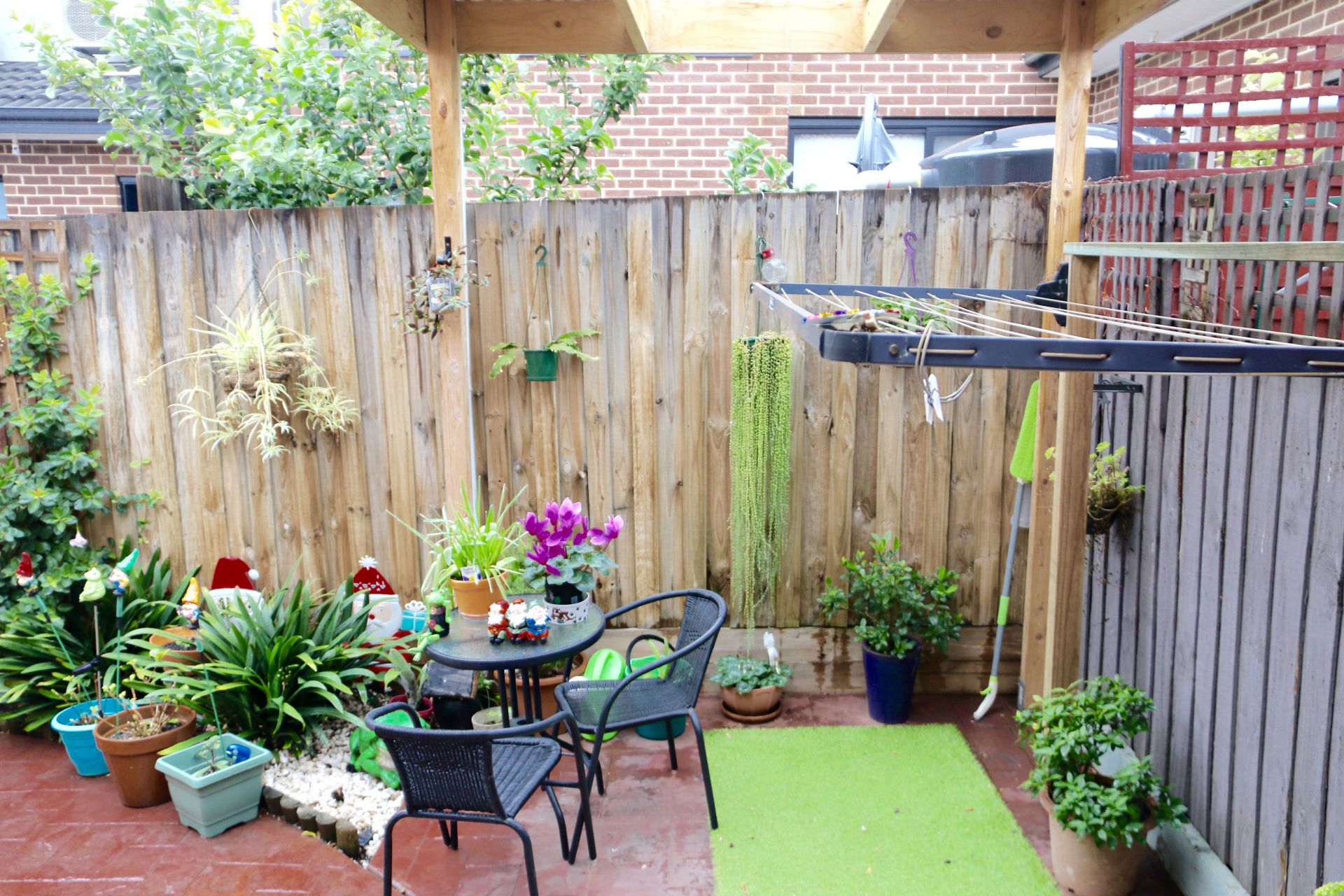 A small courtyard with beautiful manicured garden beds out the back leads into the single car garage.
