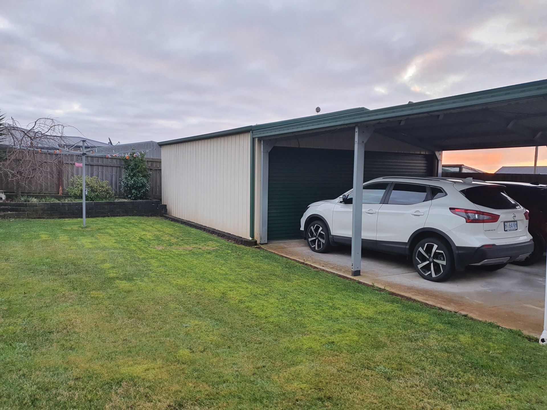 Flat grassed area for kids with small retaining wall / low maintenance gardens surrounding the yard. There is also a double colourbond garage with attached double carport.