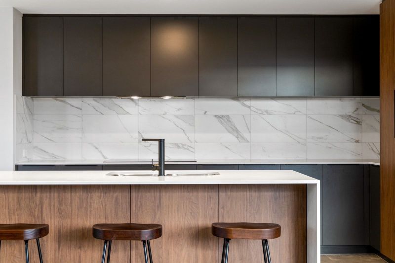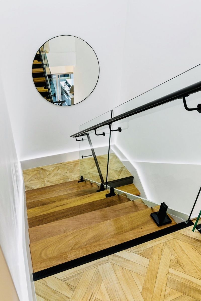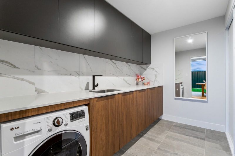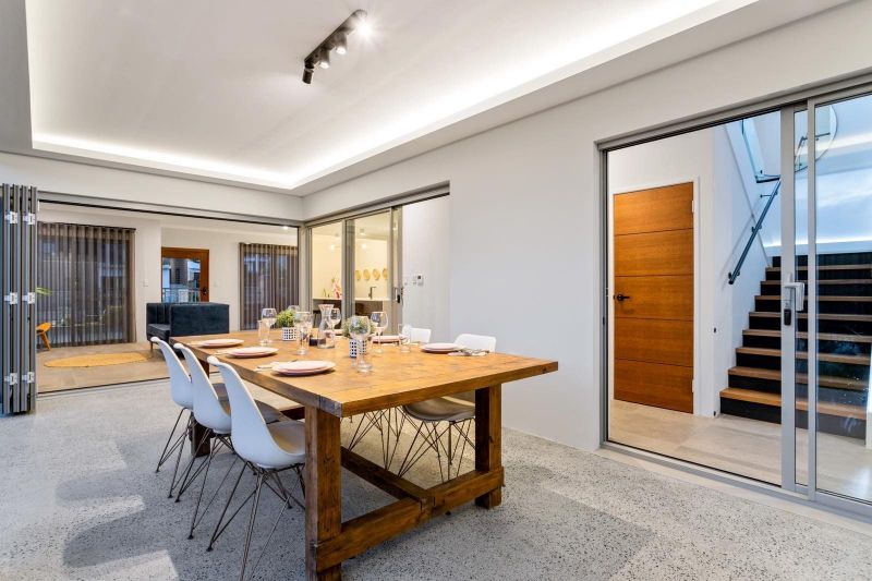 The first floor welcomes you with honed concrete flooring to the house entering in to the dining, lounge and kitchen area, with integrated appliances, and black fixtures throughout.