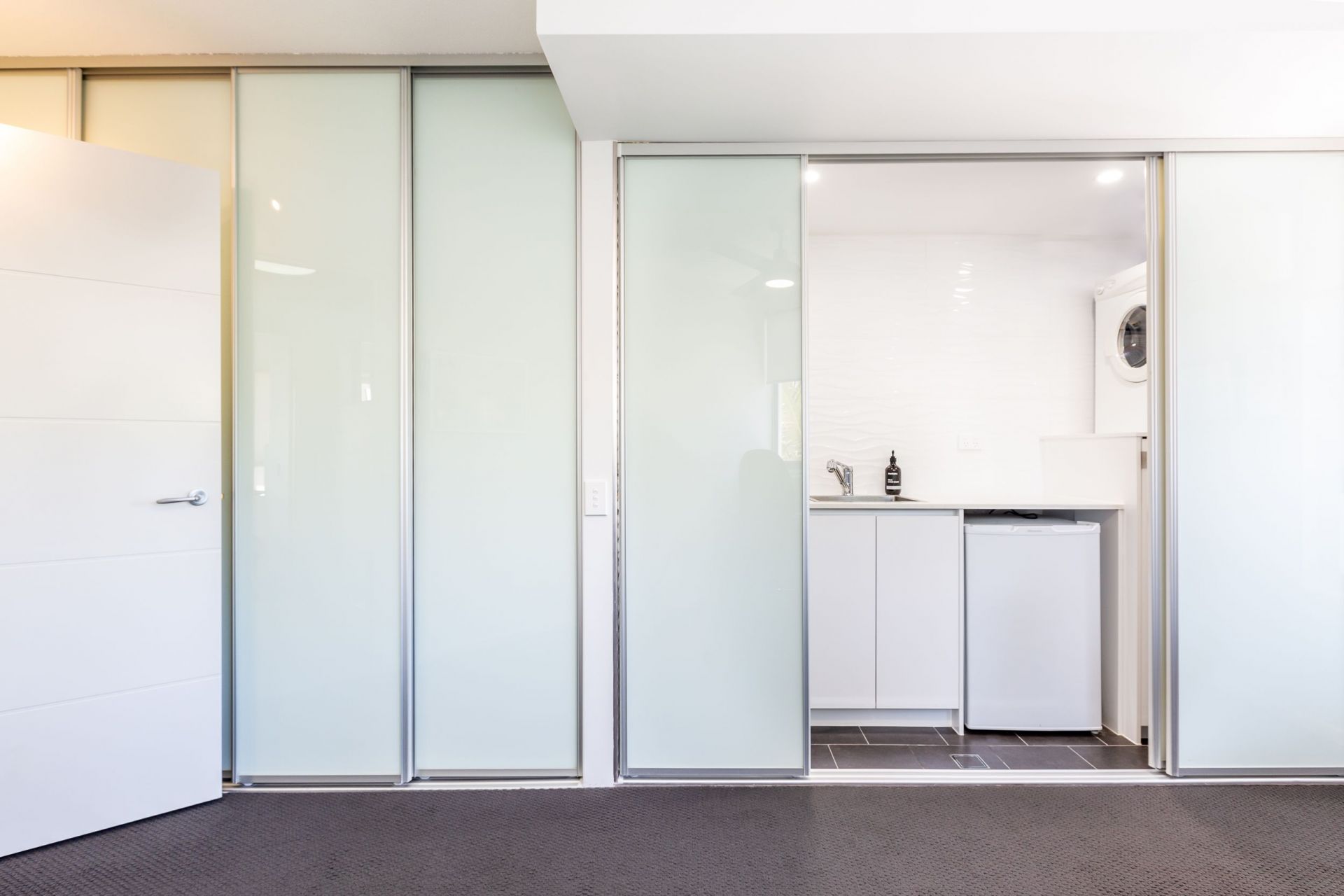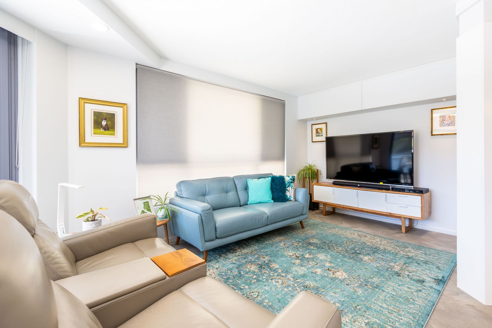 • Bespoke roller blinds on all windows and sliding doors, including automated blind in living room