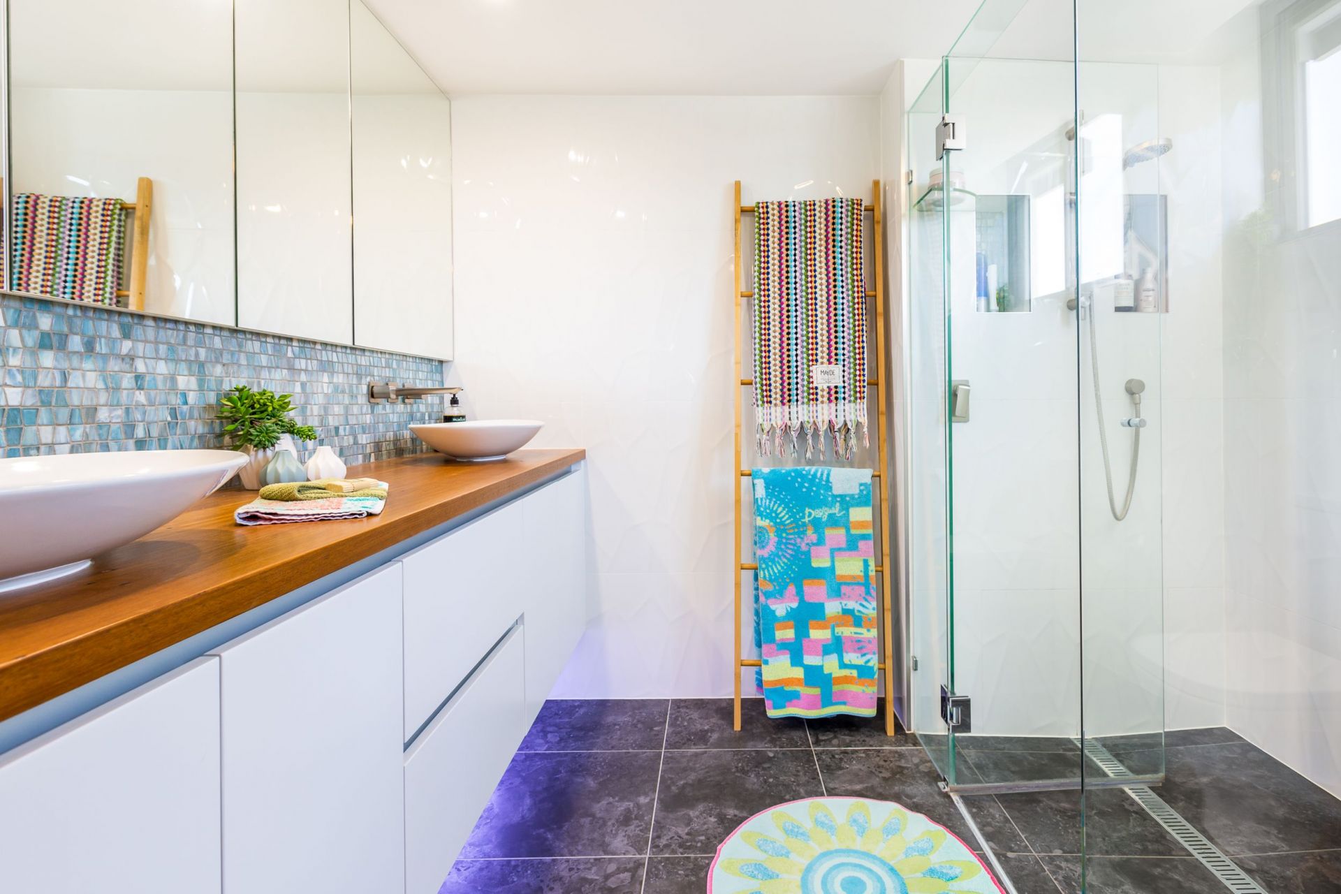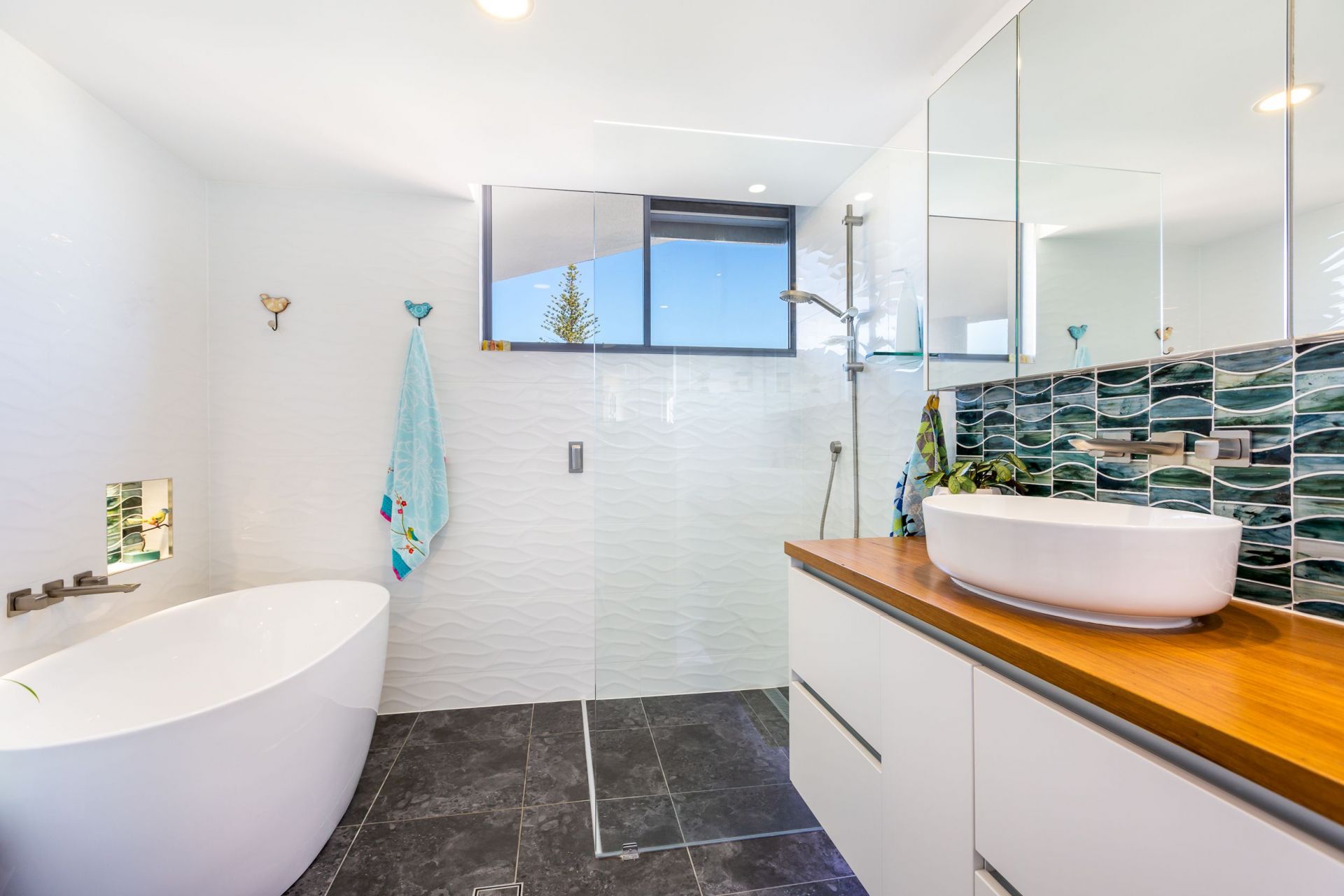 • Main bathroom with free-standing bath, timber benchtop and floor to ceiling tiles