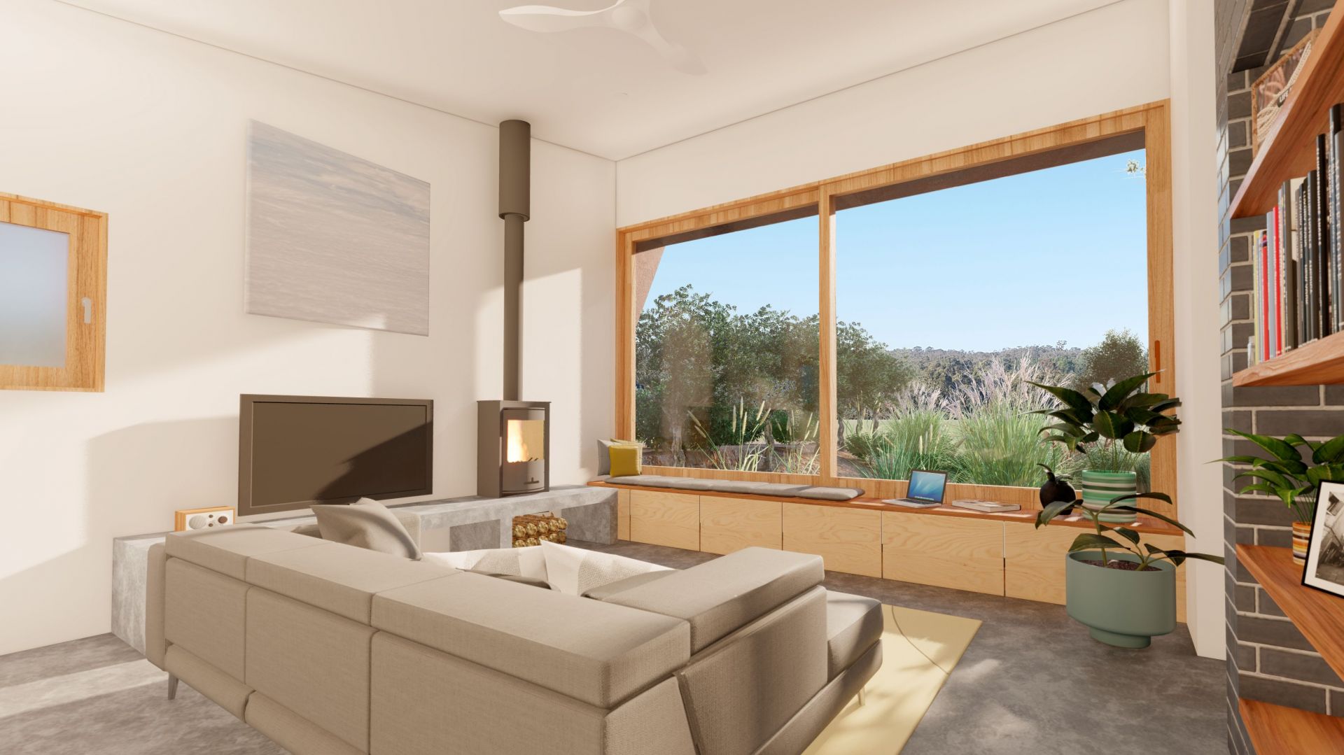 The space can also feature an optional window seat where a hot drink can be savored on a cold morning whilst bathing in the winter sun. Beneath the window seat, there is plenty of storage space, and a wood heater sits on an adjacent concrete bench (optional) with space for firewood below.