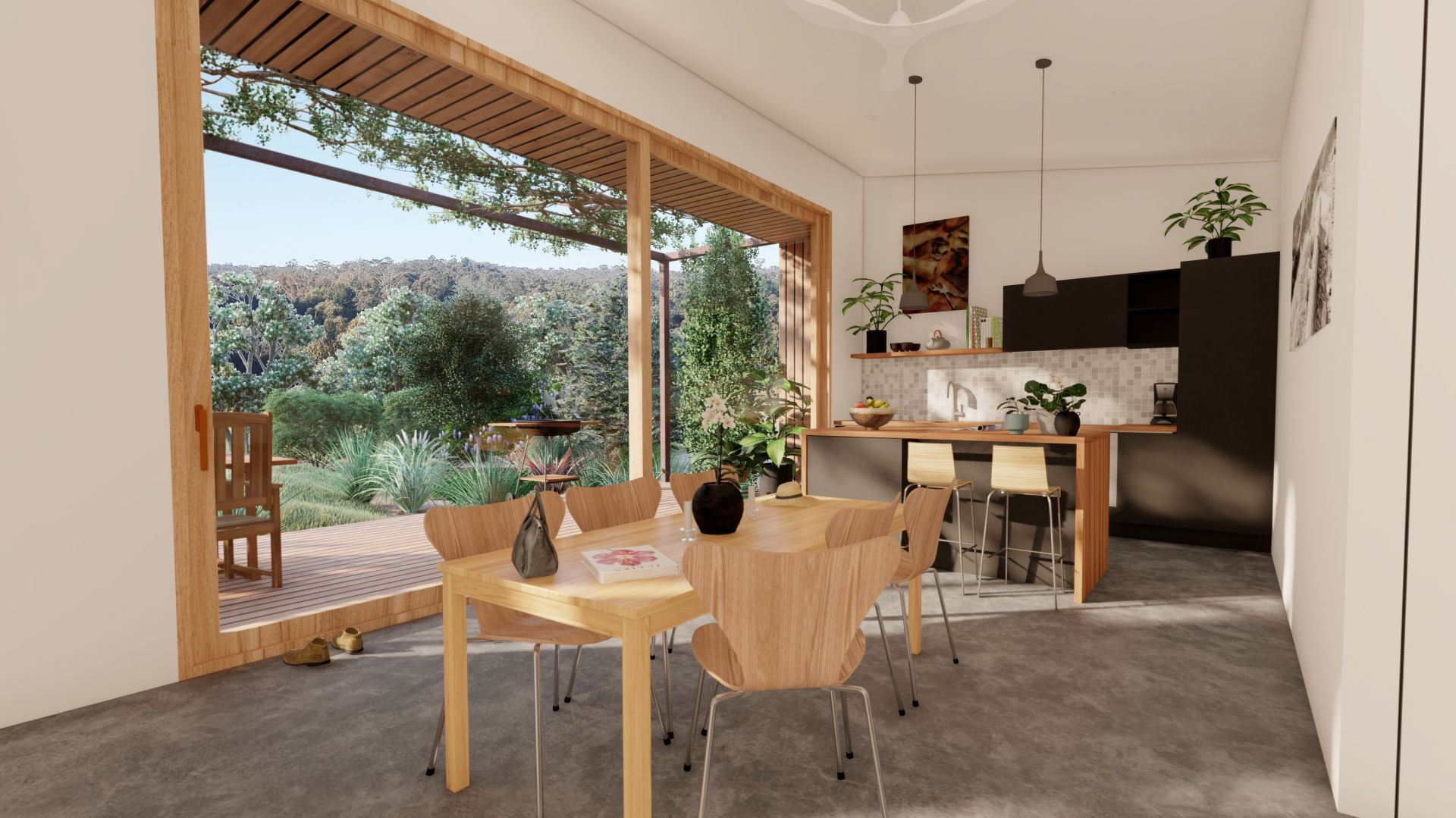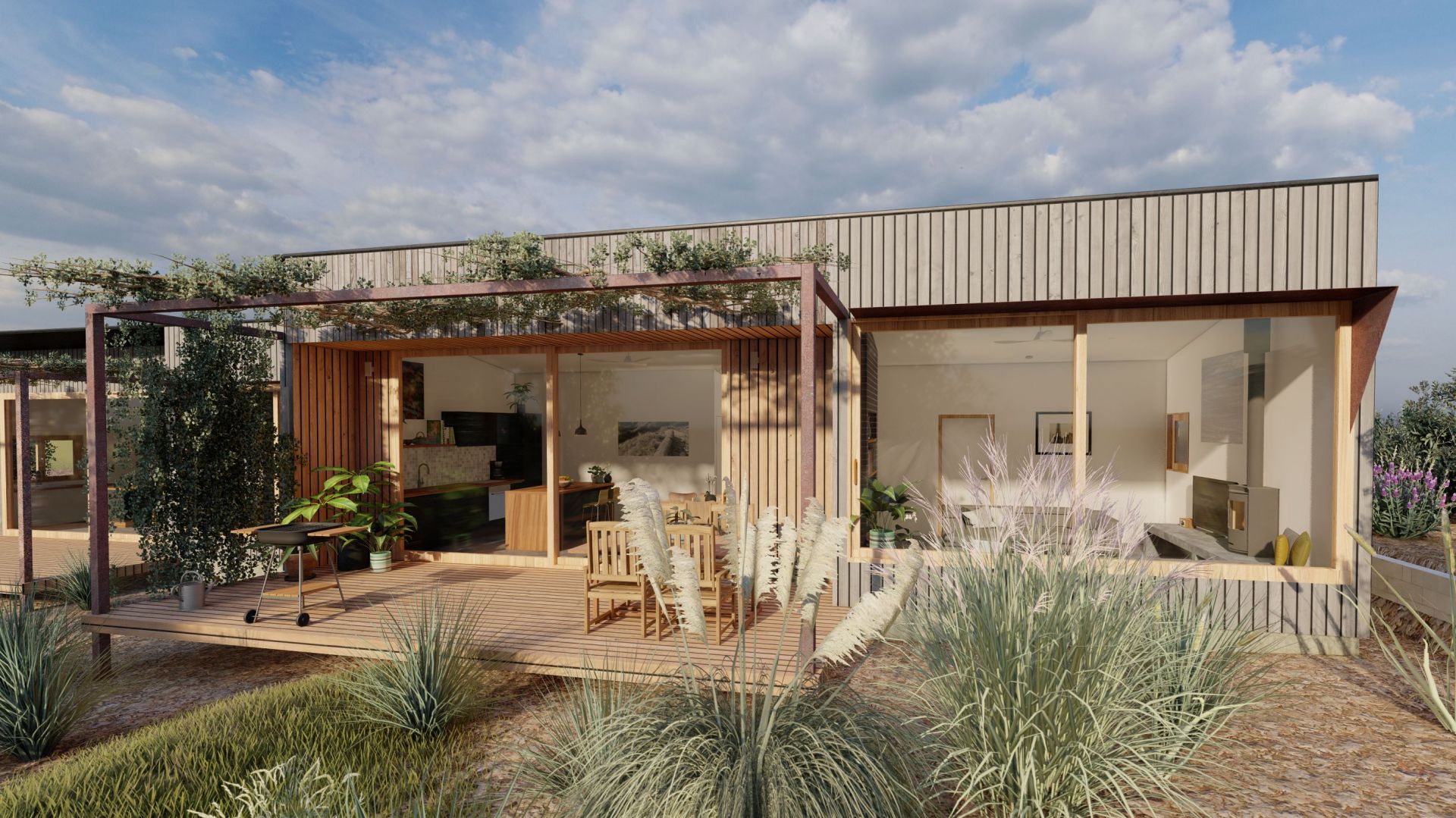 Finished with a palate of high-quality materials that will be selected with you based upon preference and budget. There are a few cladding options and the home showcases high-quality aluminium or timber doors and windows. A timber deck can be sized to suit your brief and budget and will be made from sustainably sourced Australian hardwood-complimented by a rusting steel pergola and awnings.