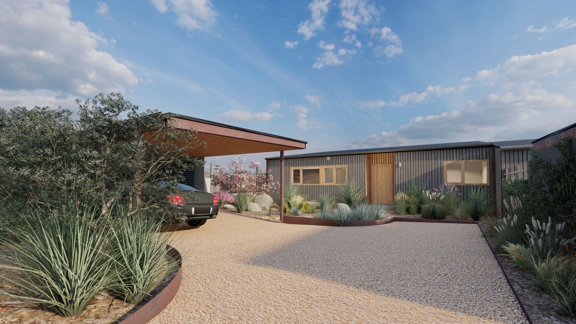 A large entry courtyard can be landscaped with the use of screening and vegetation to create privacy for the home and includes a generous single-car carport and lockable storage options.