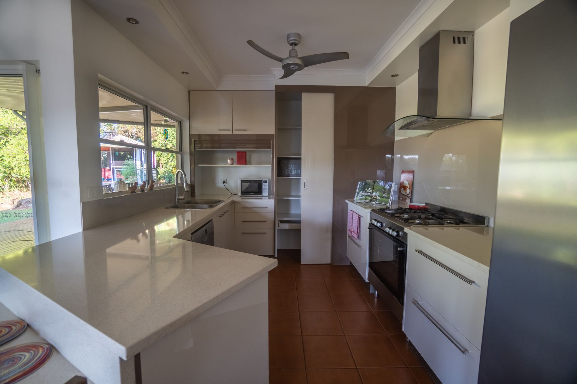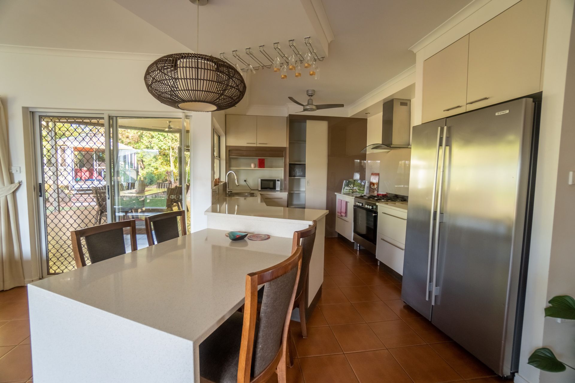 The large entertaining deck has a servery window direct from the modern kitchen which is equipped with a large (900mm) gas cooktop & stove, granite benches, double sink, walk-in pantry (with light), soft-close drawers, dishwasher and fridge/freezer included