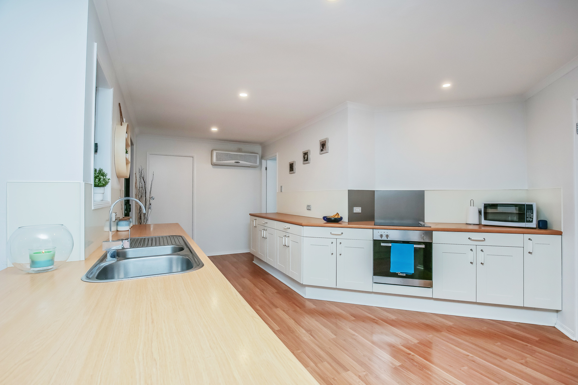 Light and airy spacious open plan kitchen with air conditioning and access to outside breakfast nook and garage.