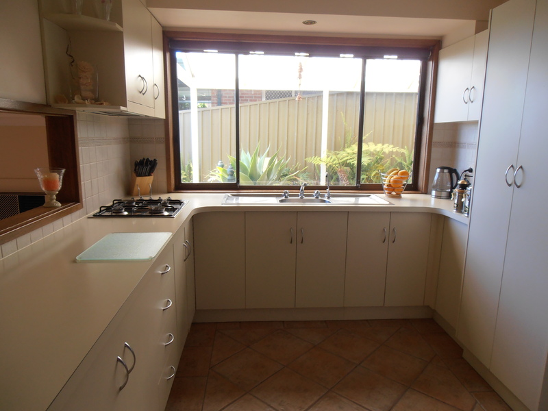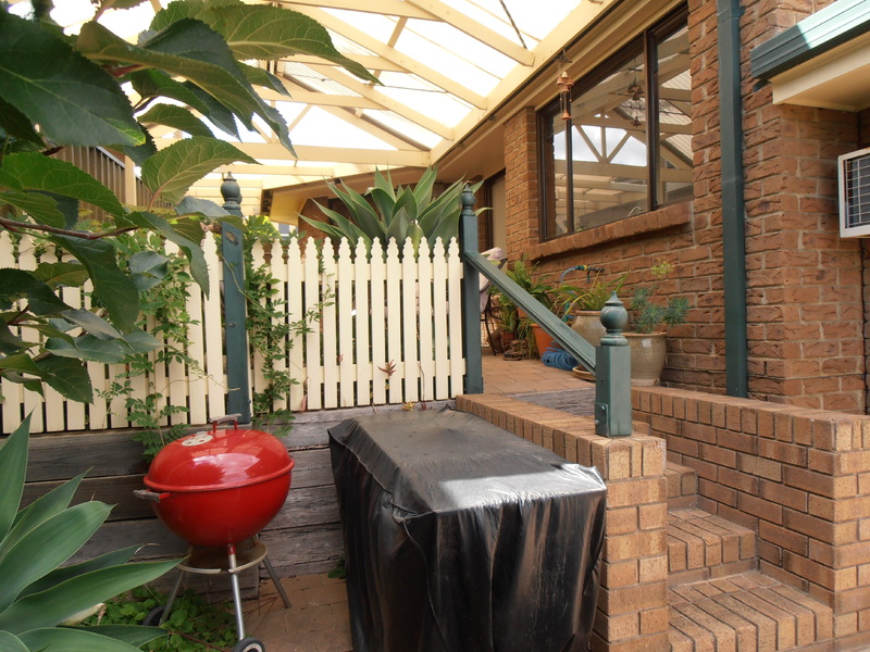 Outdoor living area with gabled roof pergola and private secure back garden Views to coast - enjoy beautiful sunsets and twinkling lights after dark. Close to shops, transport, parks, and walking trails.