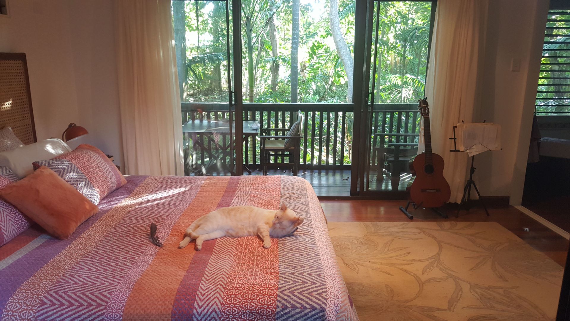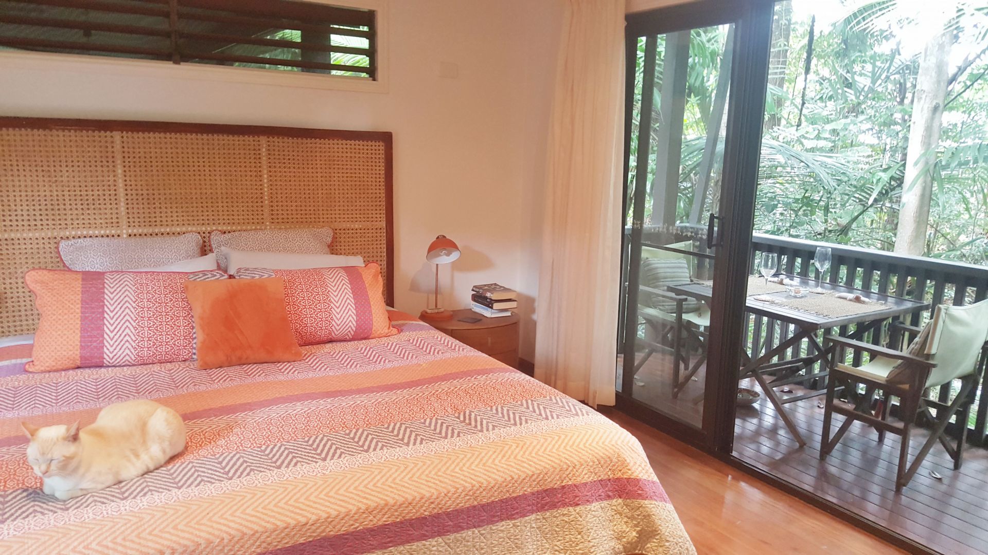 Fully air conditioned and insulated, however, the villa's open plan design and natural breezes keep it cool throughout the summer. For a natural look and security, the doors and windows are fitted with Crimsafe screens. The kitchen has stone benchtops, Bosch appliances, an induction cooktop, and a servery opens onto the verandah for semi open dining. The master bedroom, with an ensuite, spa and a walk in robe, is large and has a balcony overlooking the rainforest and creek. The garden is landscaped with a private and intimate courtyard.