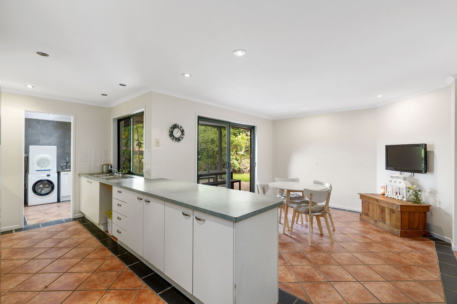 New laundry including floor to ceiling tiles and cupboards.