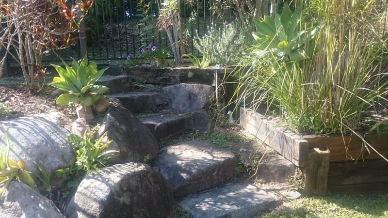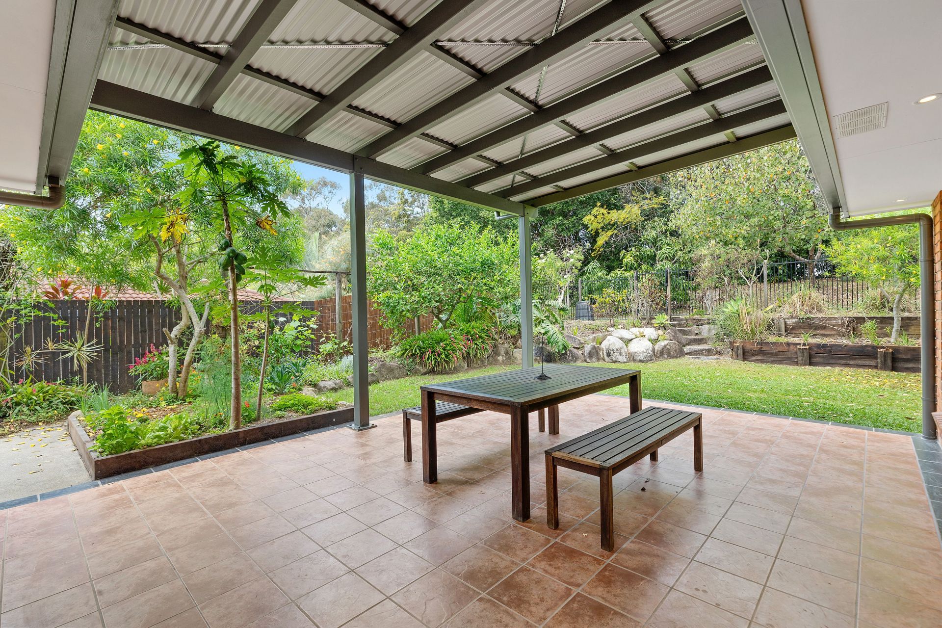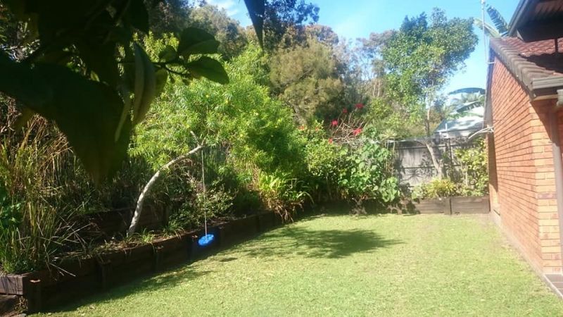 Garden full of mature fruit trees, herbs, veggies and grassy play area with raised garden beds to rear and one side. Lemons, Oranges, Lemonade, Grapes and pawpaws and Bananas on now. Mulberrys just finished.