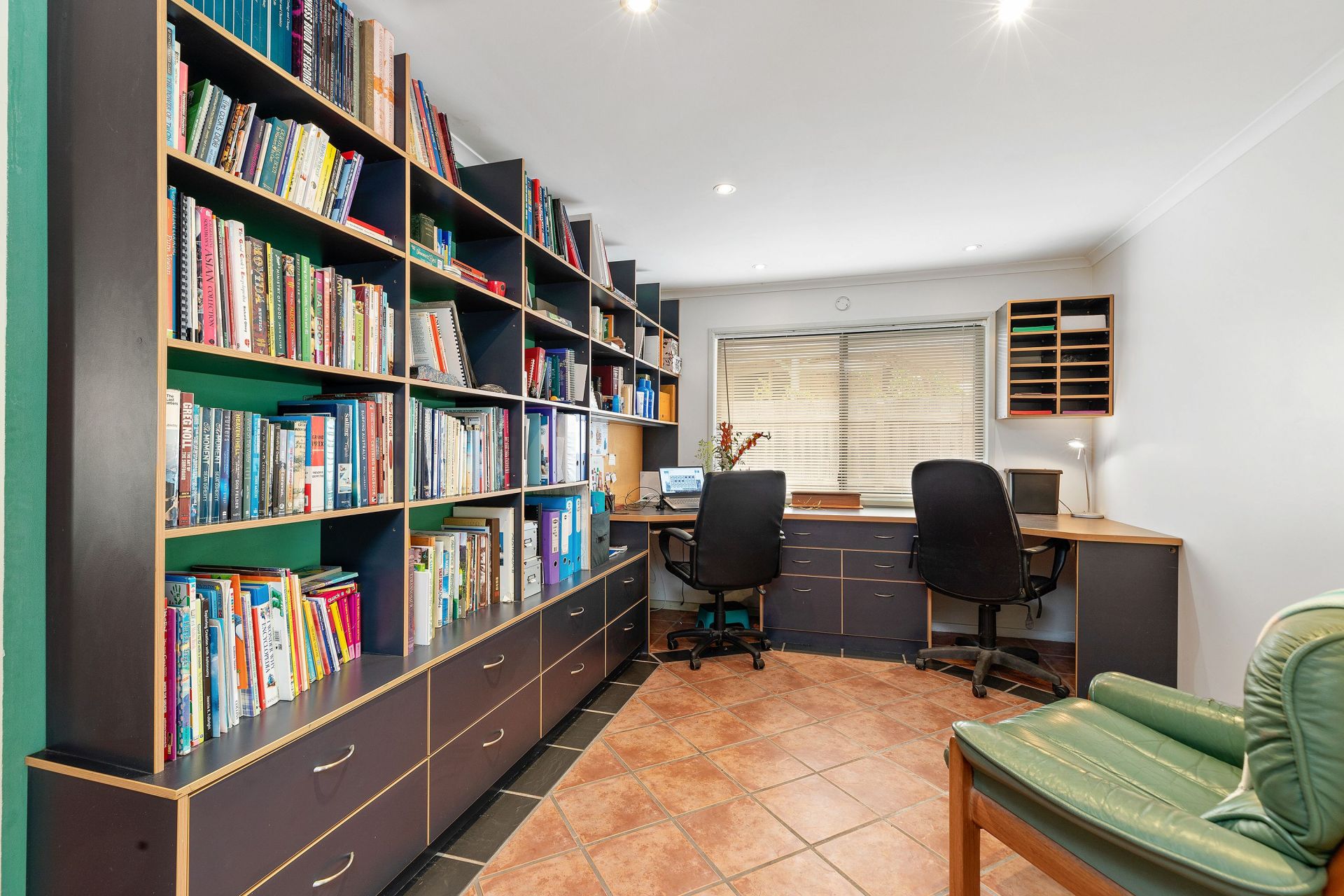 Floor to ceiling book storage and drawers in study with two work areas.