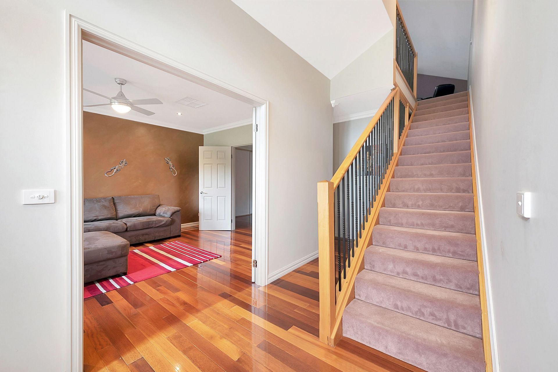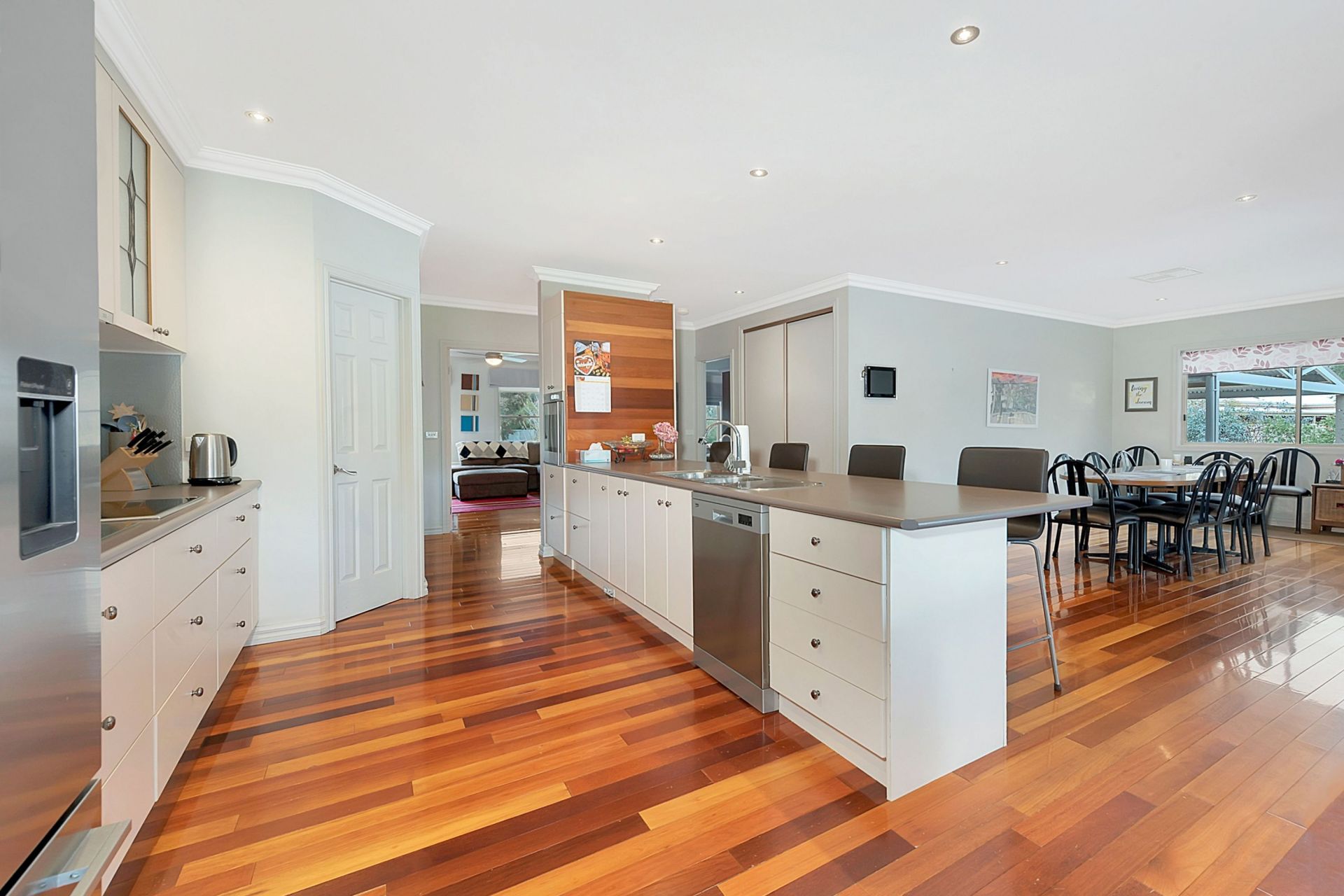 Solid Kempus wood floor in main living area and kitchen. 9ft ceilings in downstairs area, with detailed cornice. Upstairs is a big rumpus theatre room.