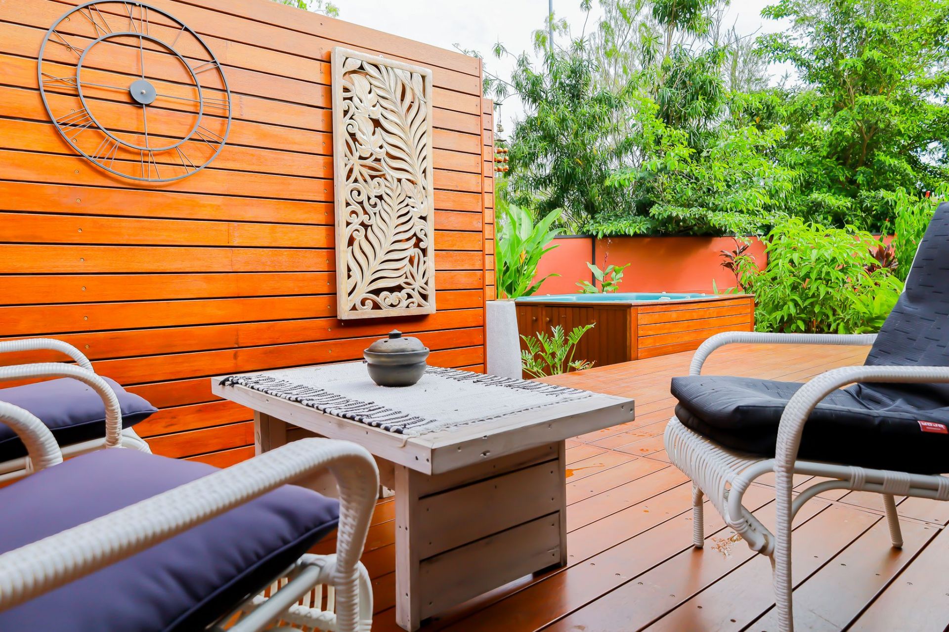 Relax and unwind on the sensational timber deck at the rear of the home, cool down in the built-in spa surrounded by a tropical garden which offers complete privacy.