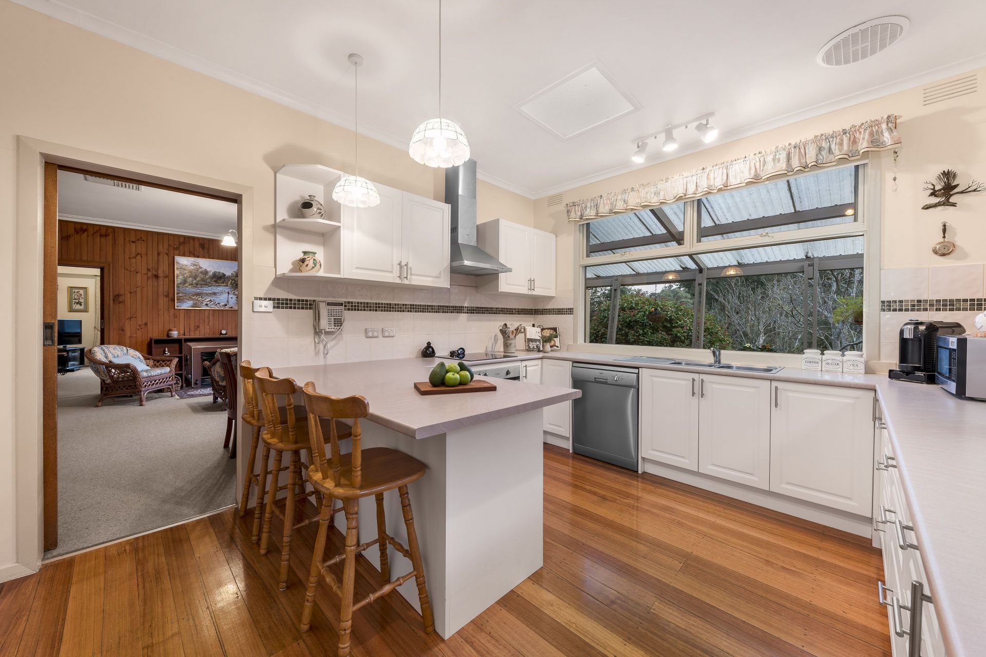 - Modern Kitchen with plenty of bench space, stove, oven, dishwasher and breakfast bar for four people. Adjacent spacious walk-in pantry and plenty of modern cupboard space. Large windows provide a calming country view.