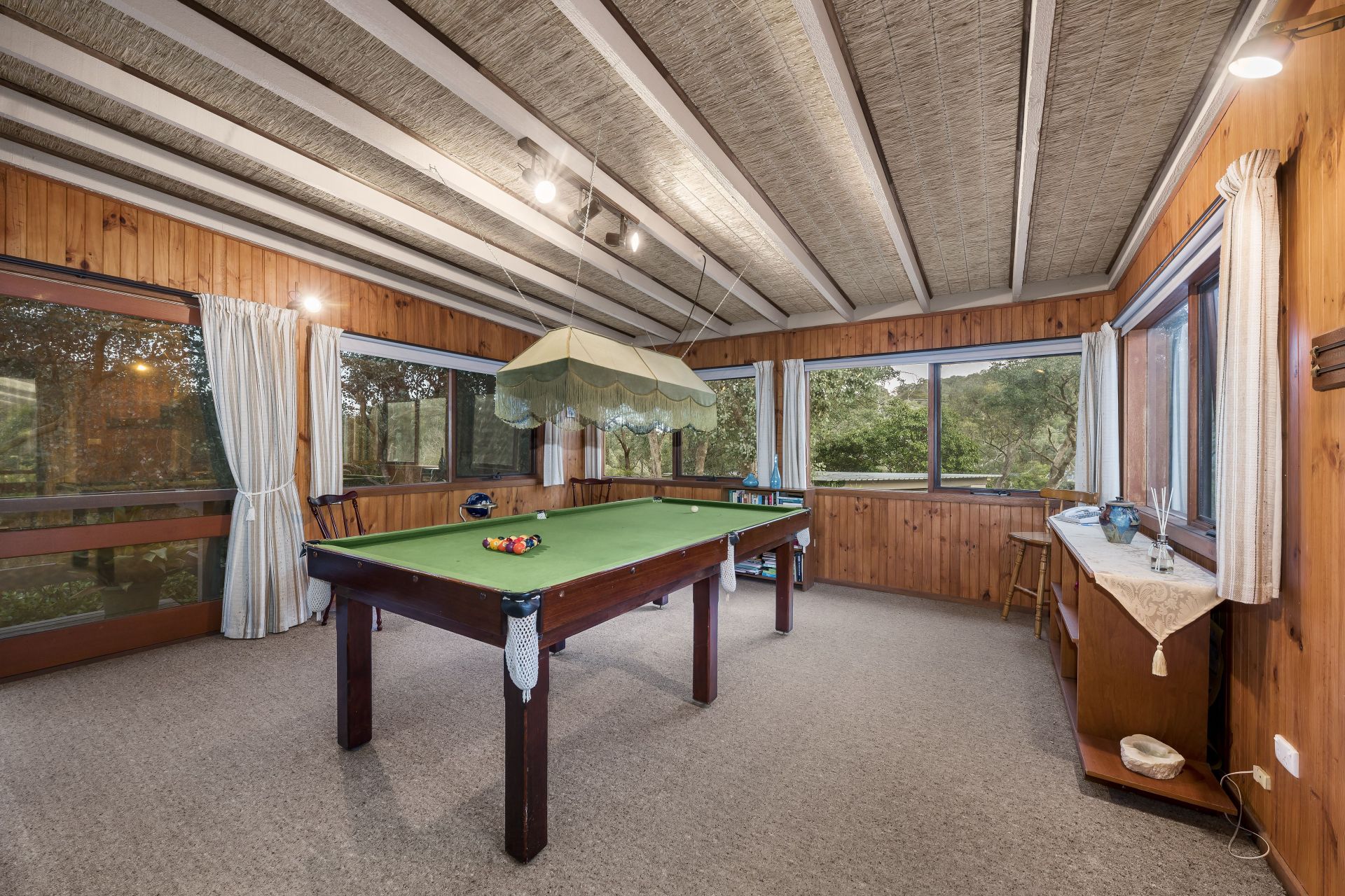 - Adjacent is the Billiard Room with fully equipped table for Pool or Snooker, matching straw-lined ceiling and access to the verandas.