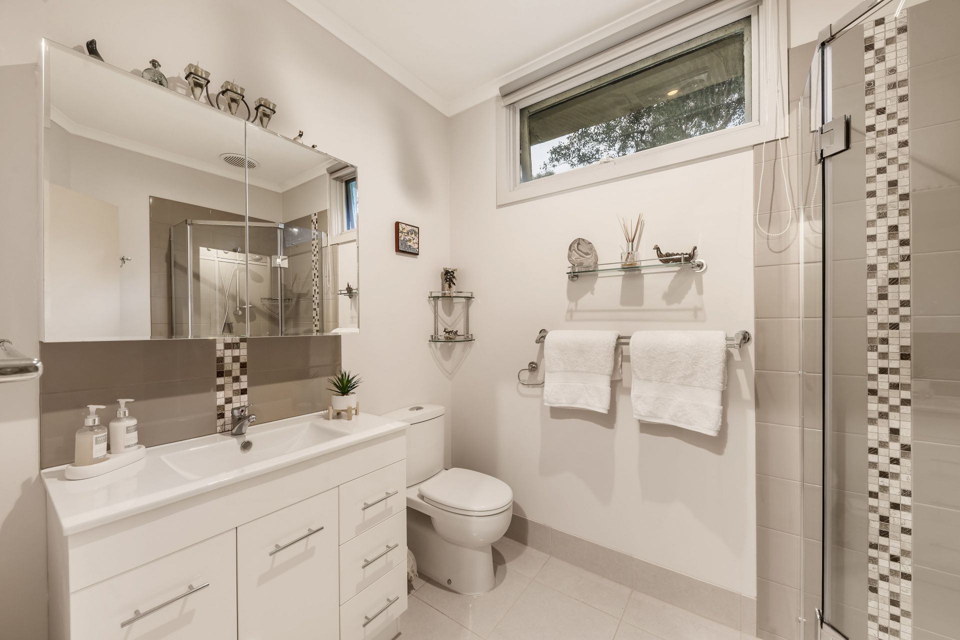 - Along a passageway with extensive linen cupboards and wardrobe spcae to a near-new designer Bathroom 1.