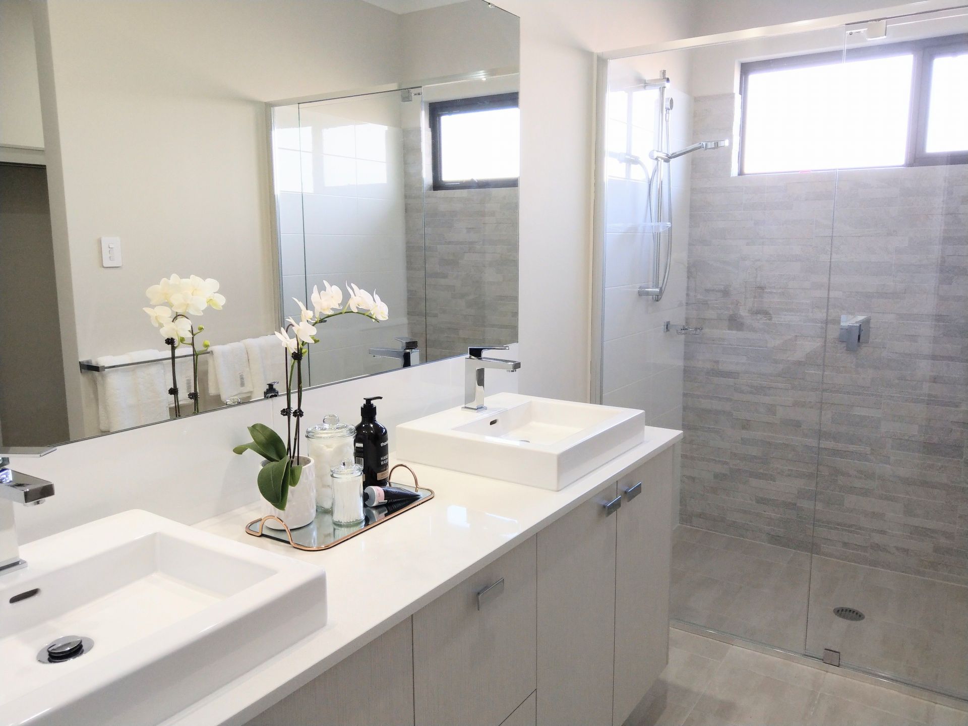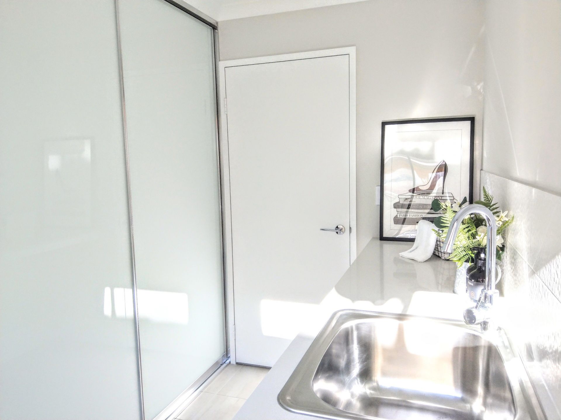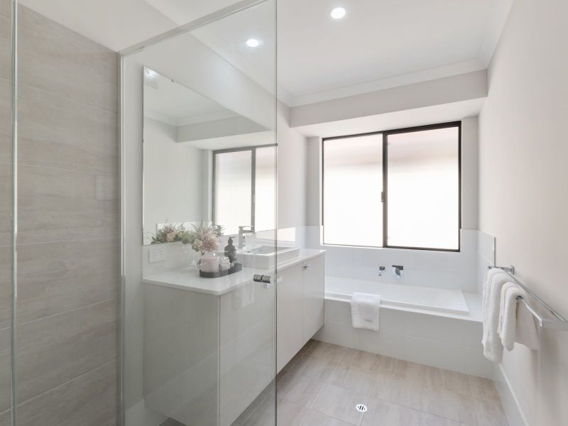 Off the open plan living area moving to a second hallway, you have a beautifully appointed laundry with Caesarstone benchtop and modern tile splashback. There is a floor-to-ceiling three frosted Perspex sliders linen/storage space and dedicated area for brooms/vacuum cleaner/ironing board. The family bathroom is larger than standard, wide Caesarstone benchtop, wide hobless shower with featured tiles, large bath and 900mm double towel rail. There is a separate modern powder room.
