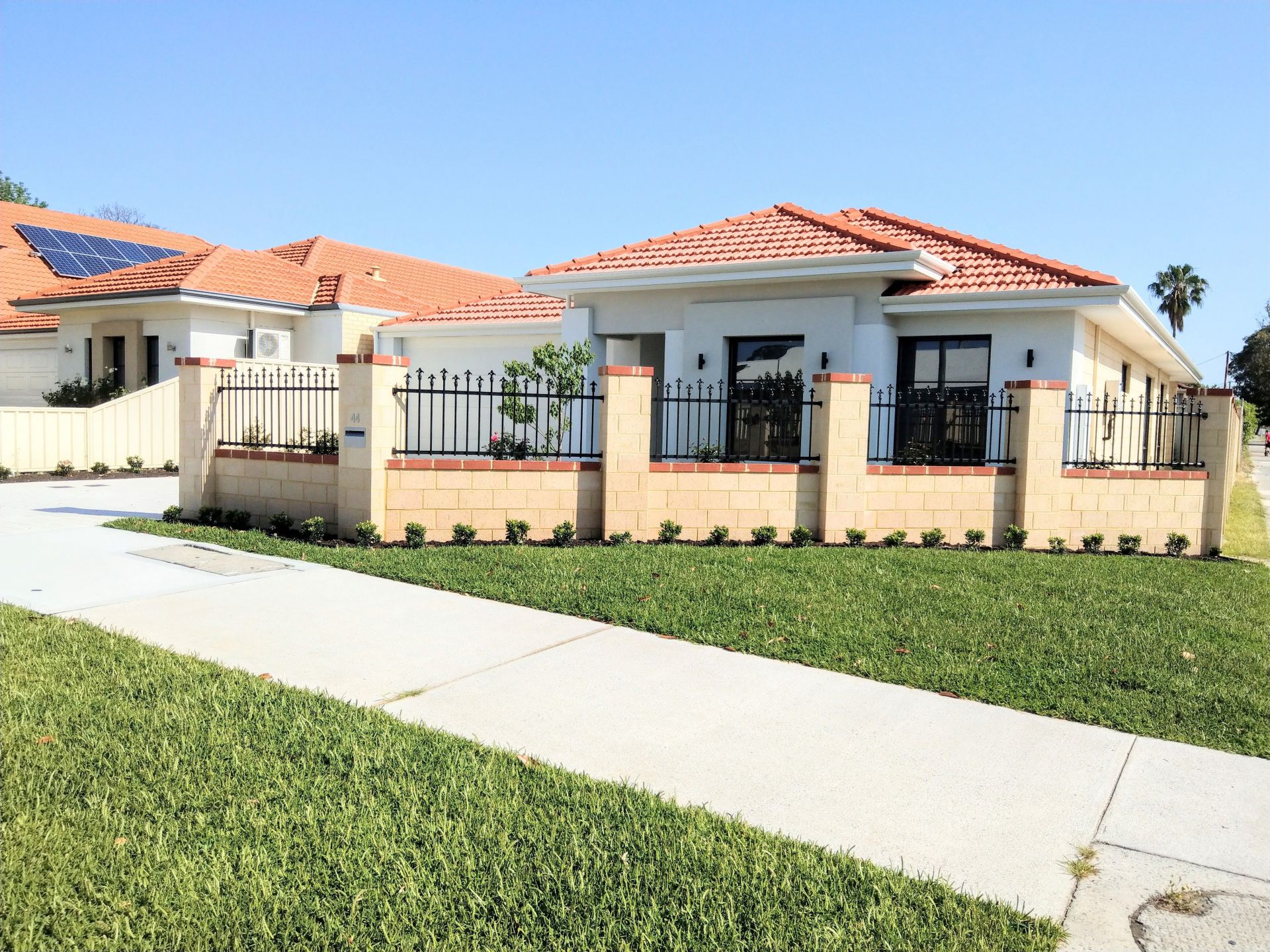 The front garden is surrounded by brick fence, regency infill panels with fleurs-de-lis, beautiful floribunda standard roses, Chinese Tallow tree, snow maiden lilly-pilly hedges and front lawn. The garden is Wi-Fi enabled automatically reticulated.