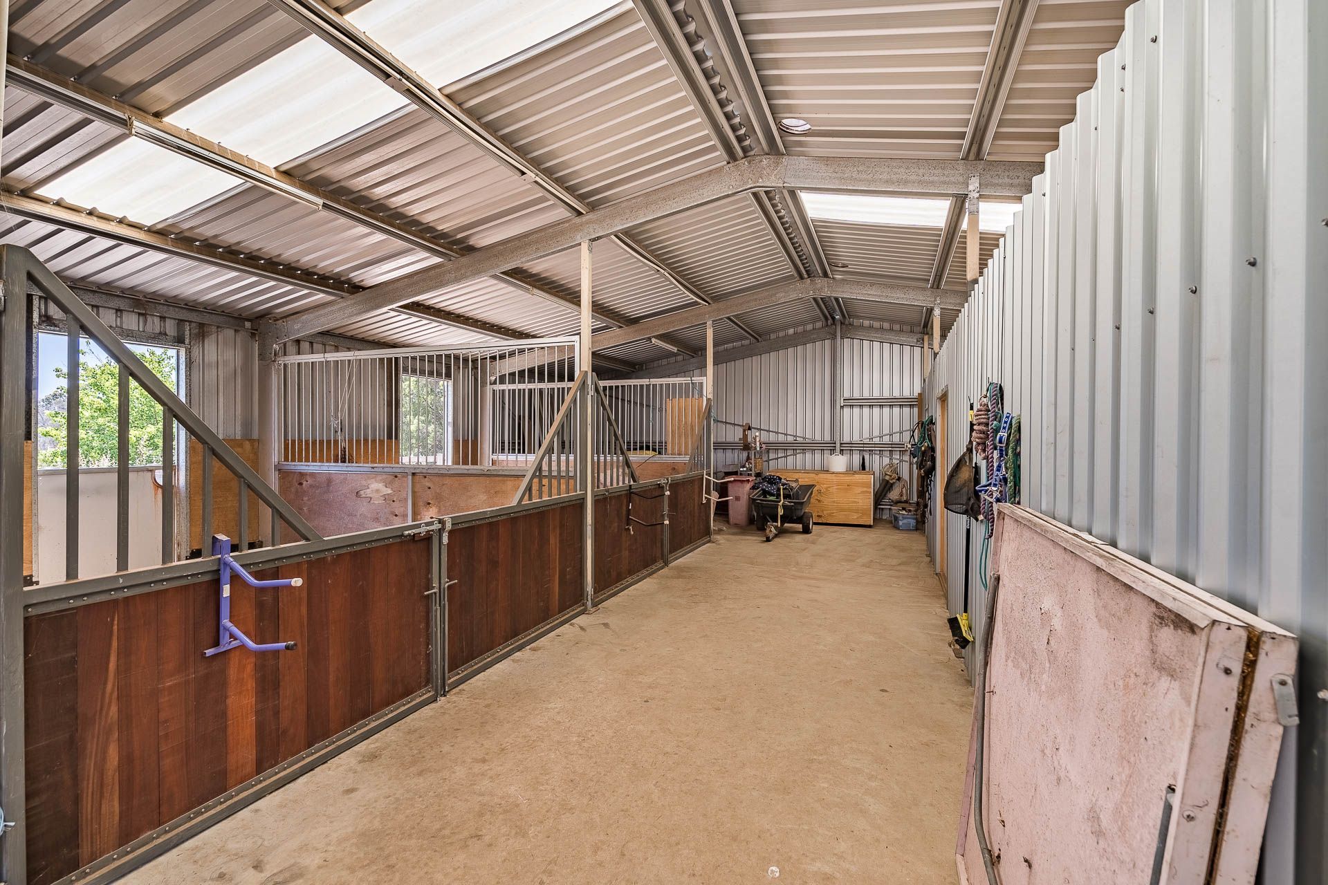 • 16m x 12 m stable block, containing two completed stables with yards and space for an additional 2 stables, tack room, feed room and storage, power, water, an instant hot water system and plumbing for a washing machine.