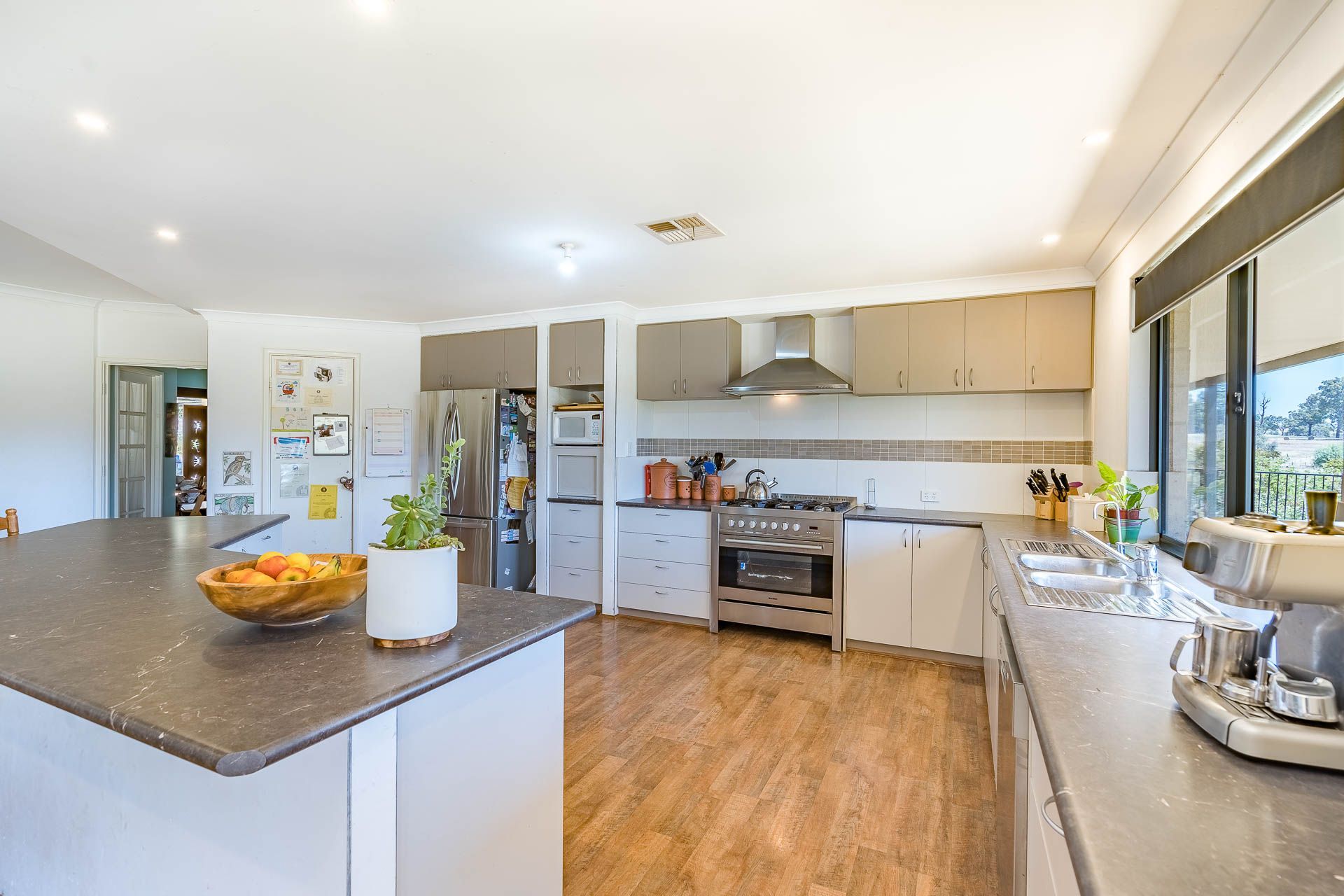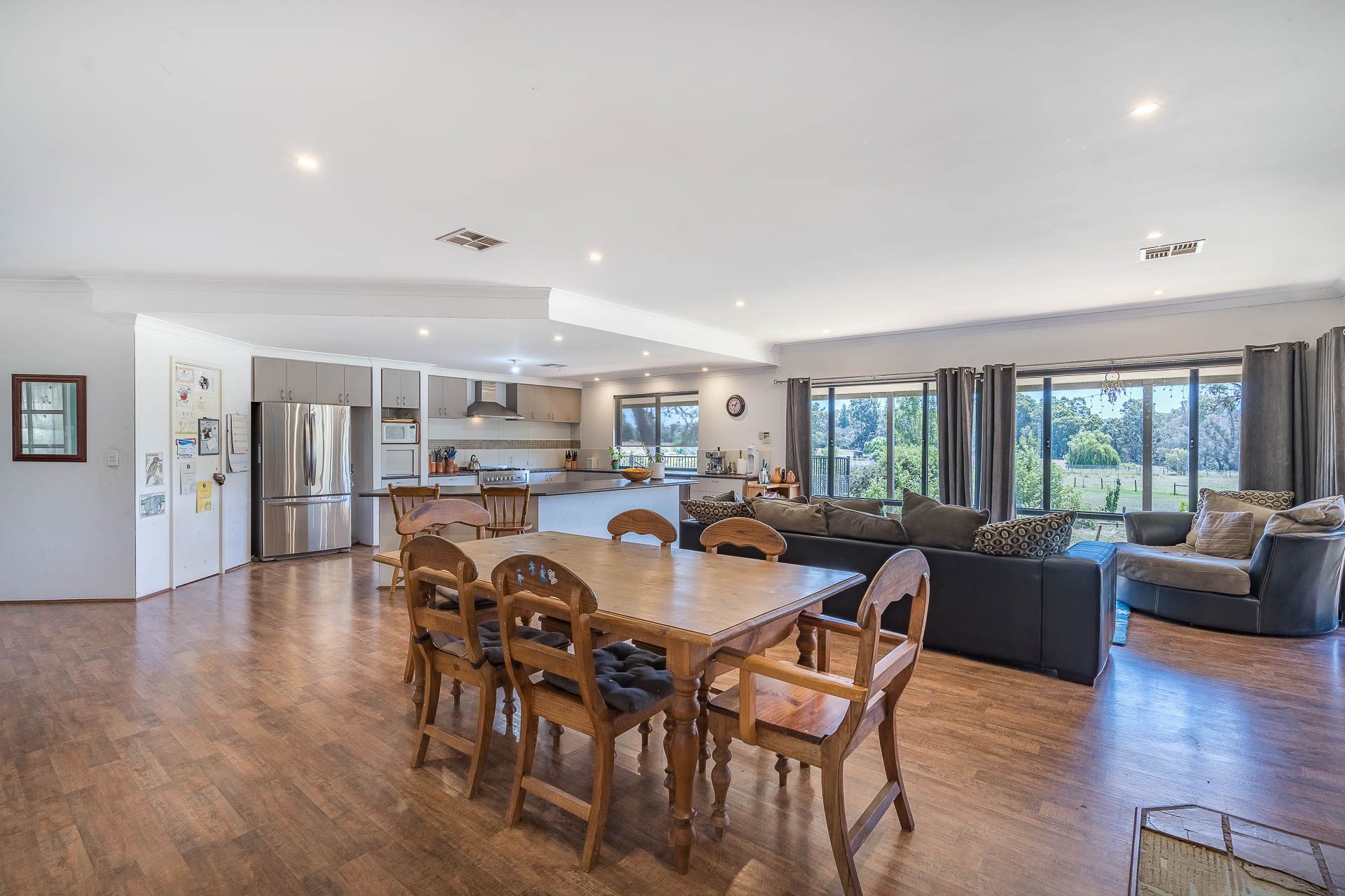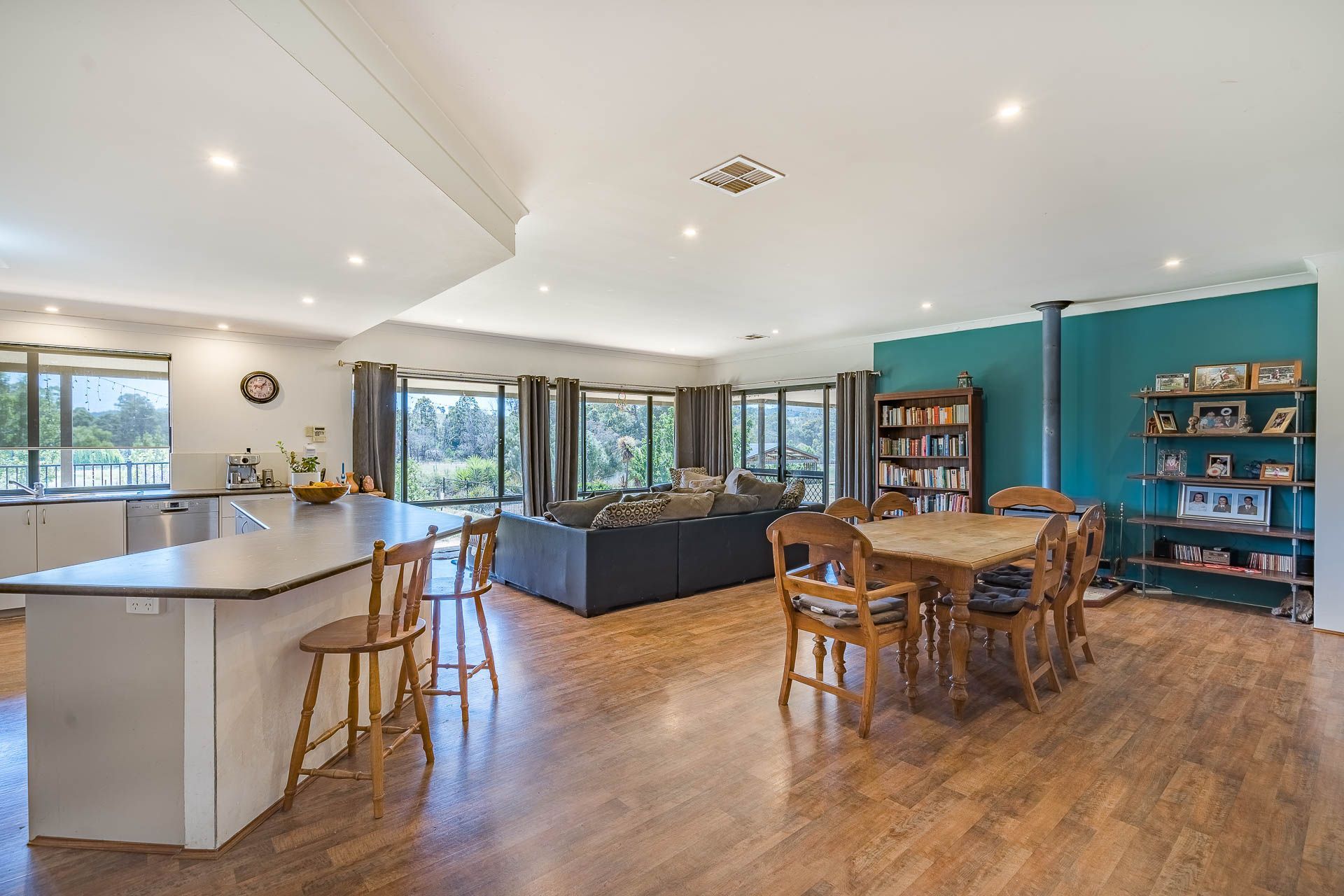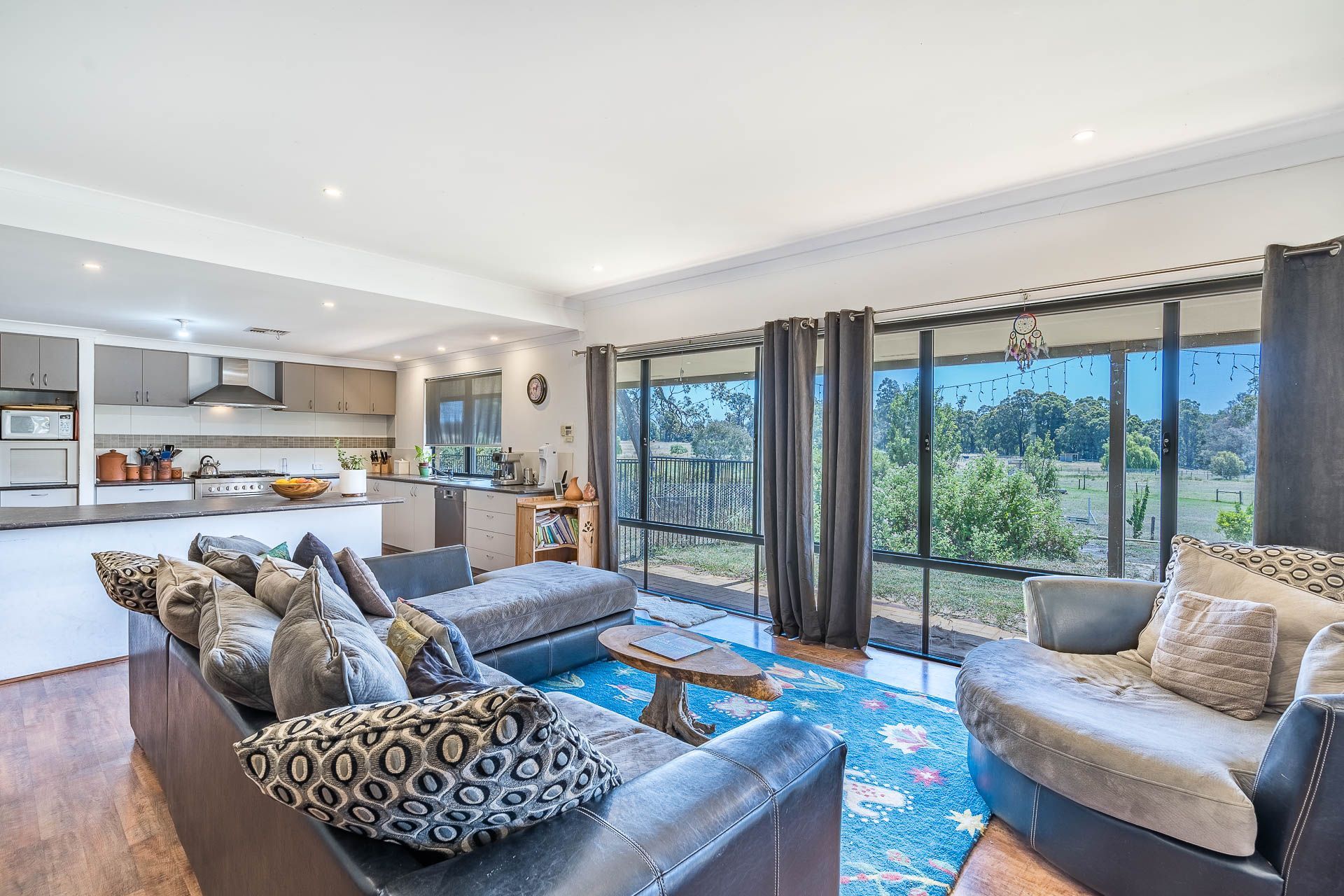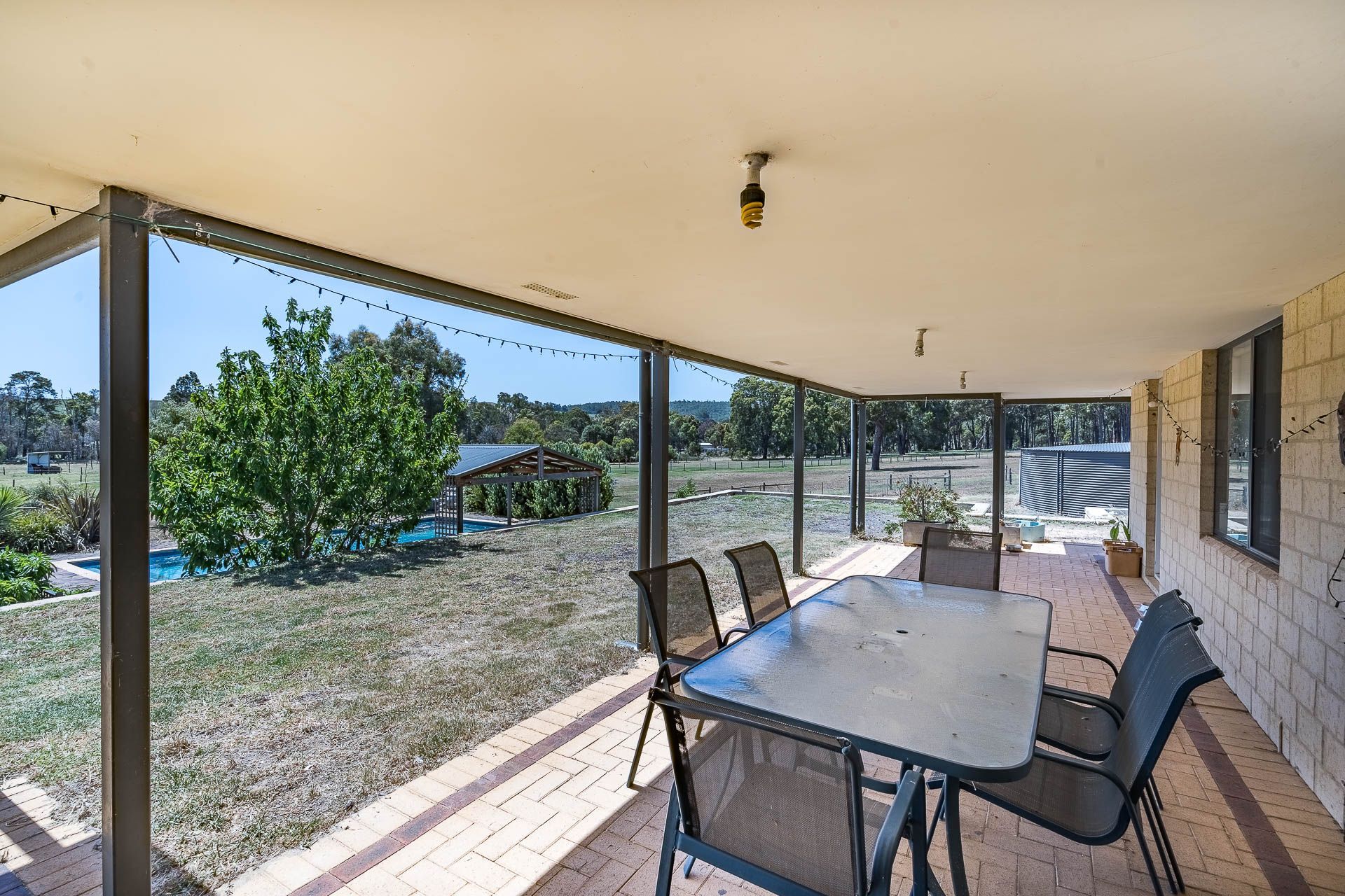The large, modern 5 bedroom, 2 bathroom homestead, has a spacious entry which leads into the well appointed, open plan kitchen & living area. With the master bedroom, theatre room and home office at one end of the house, and four big bedrooms, separate toilet and laundry at the other end, this is a wonderful family home. There is ducted reverse cycle air conditioning throughout, and a Jarrahdale wood heater for warming the house in winter.