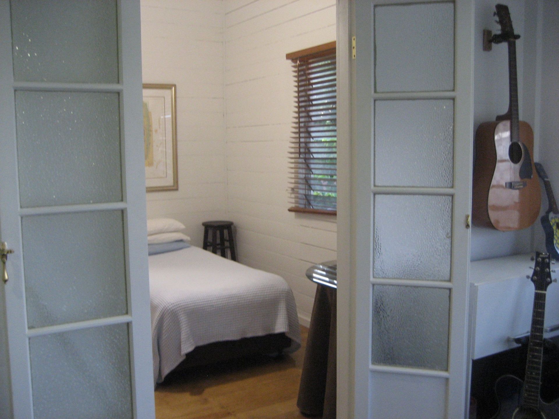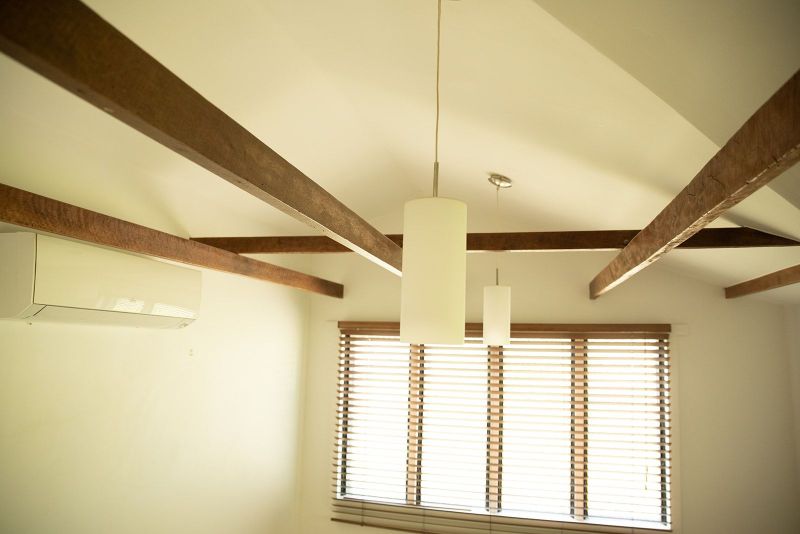 The front of house master bed room features unique cathedral style ceiling with exposed beams, pendant lights, reverse cycle air con and walk through his and her robe to bathroom.