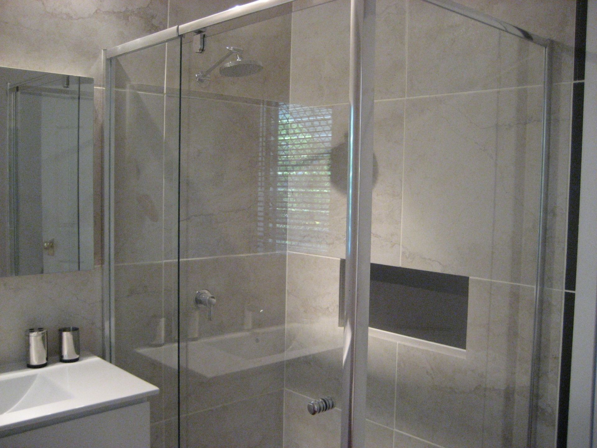 The large stylish bathroom features polished timber floor and unique bath complimented with large imported tiles, quality fixtures, wall mounted vanity and large shower.