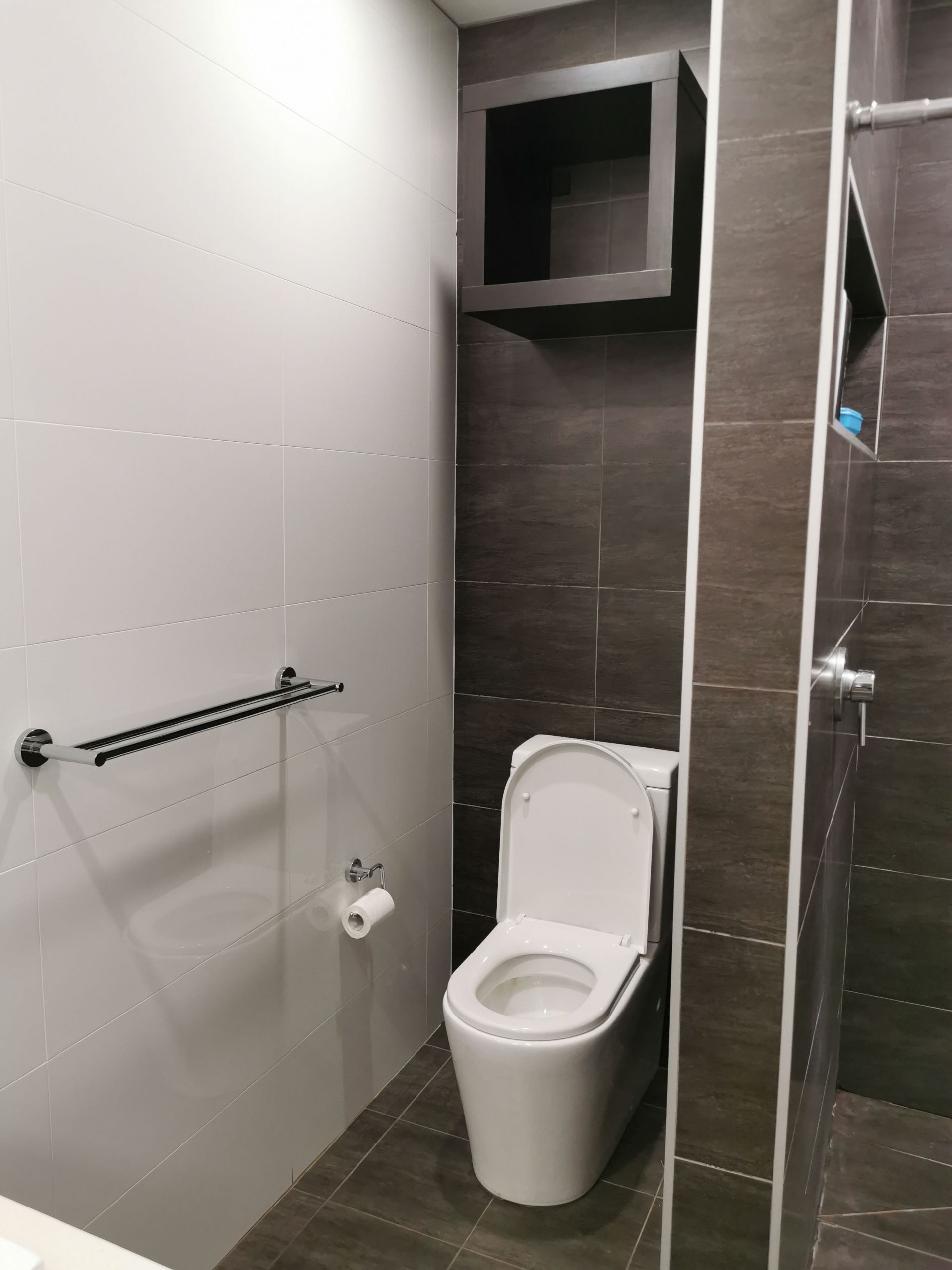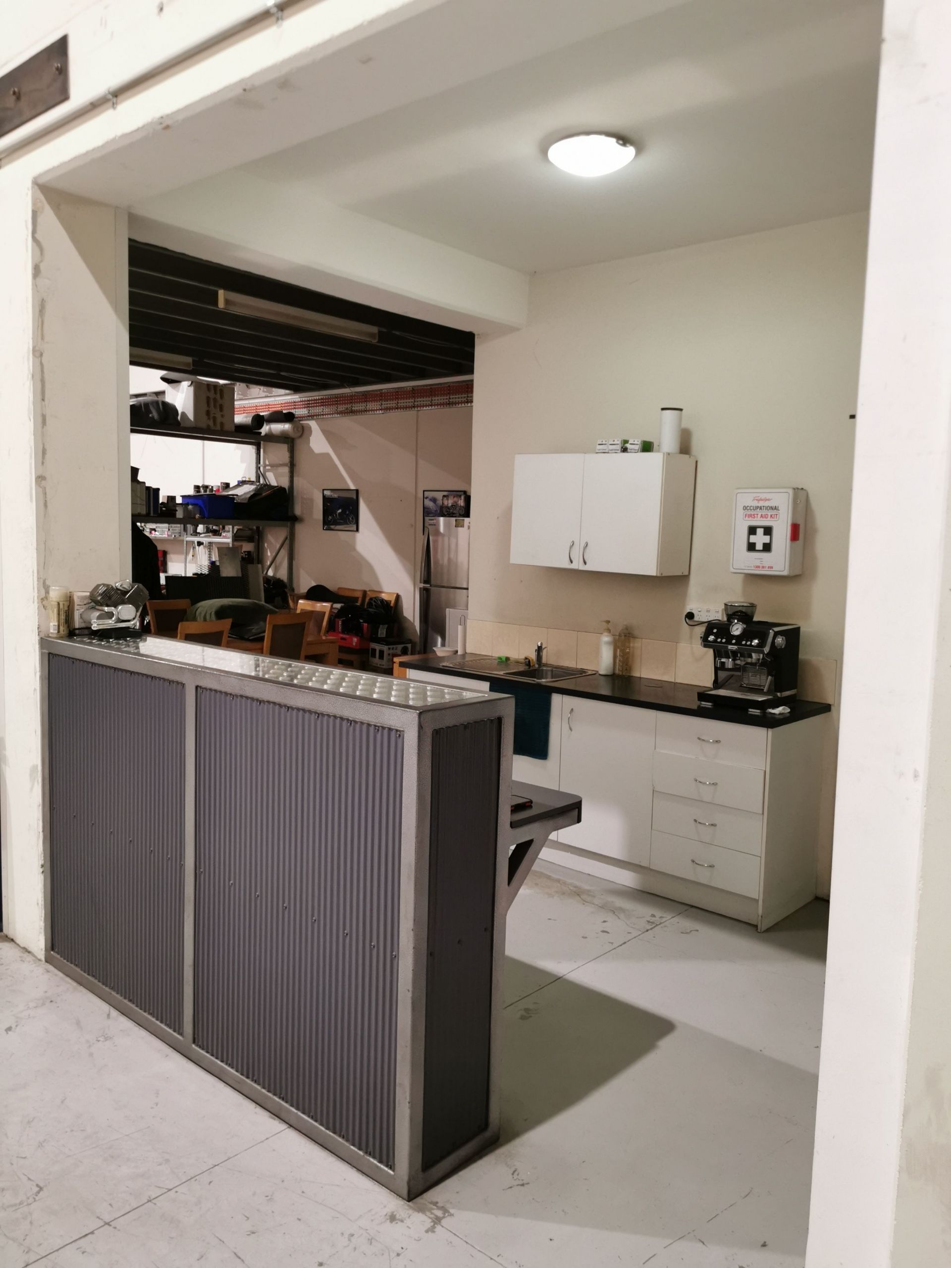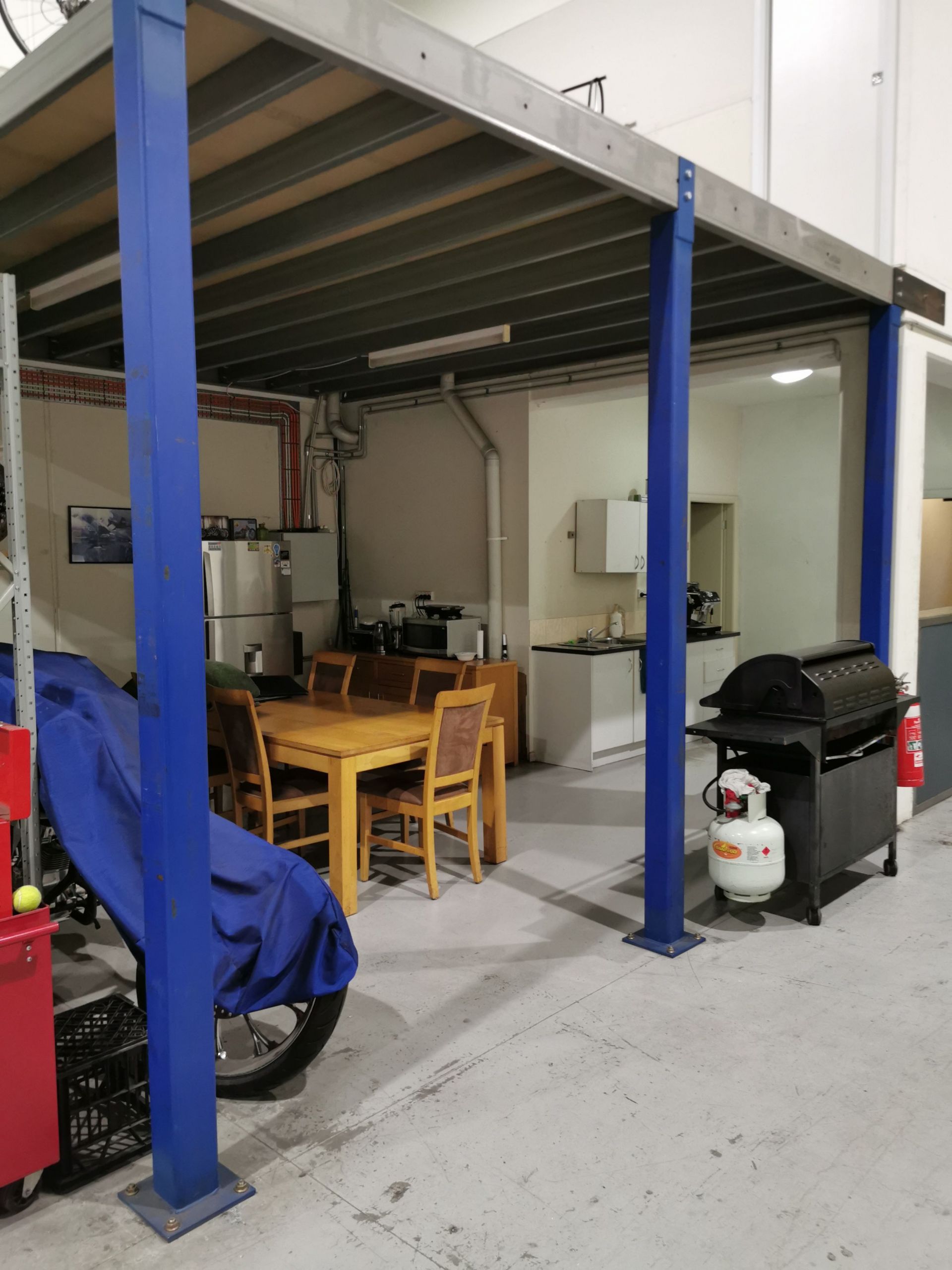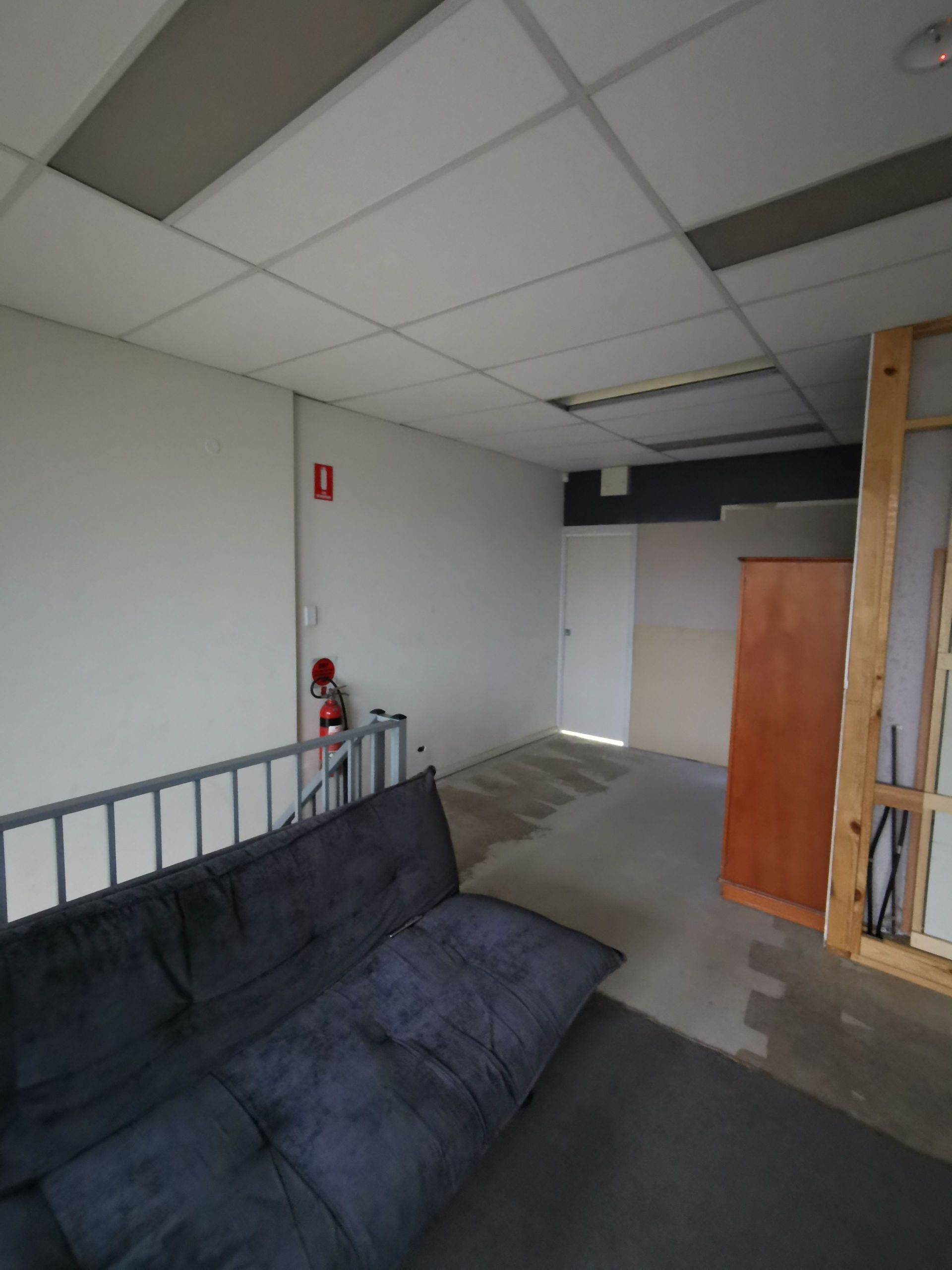Upstairs office with modern amenities that includes bathroom and shower facilities.