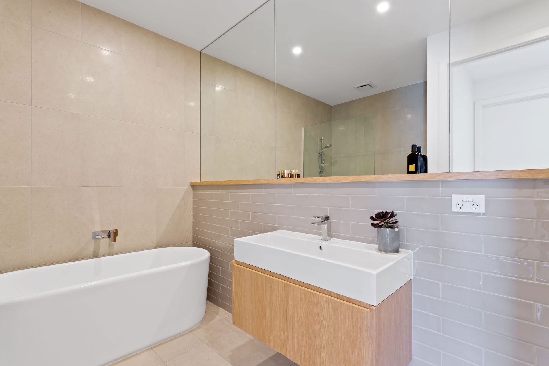 - Hotel inspired Central bathroom with walk-in shower and a luxurious freestanding bathtub.