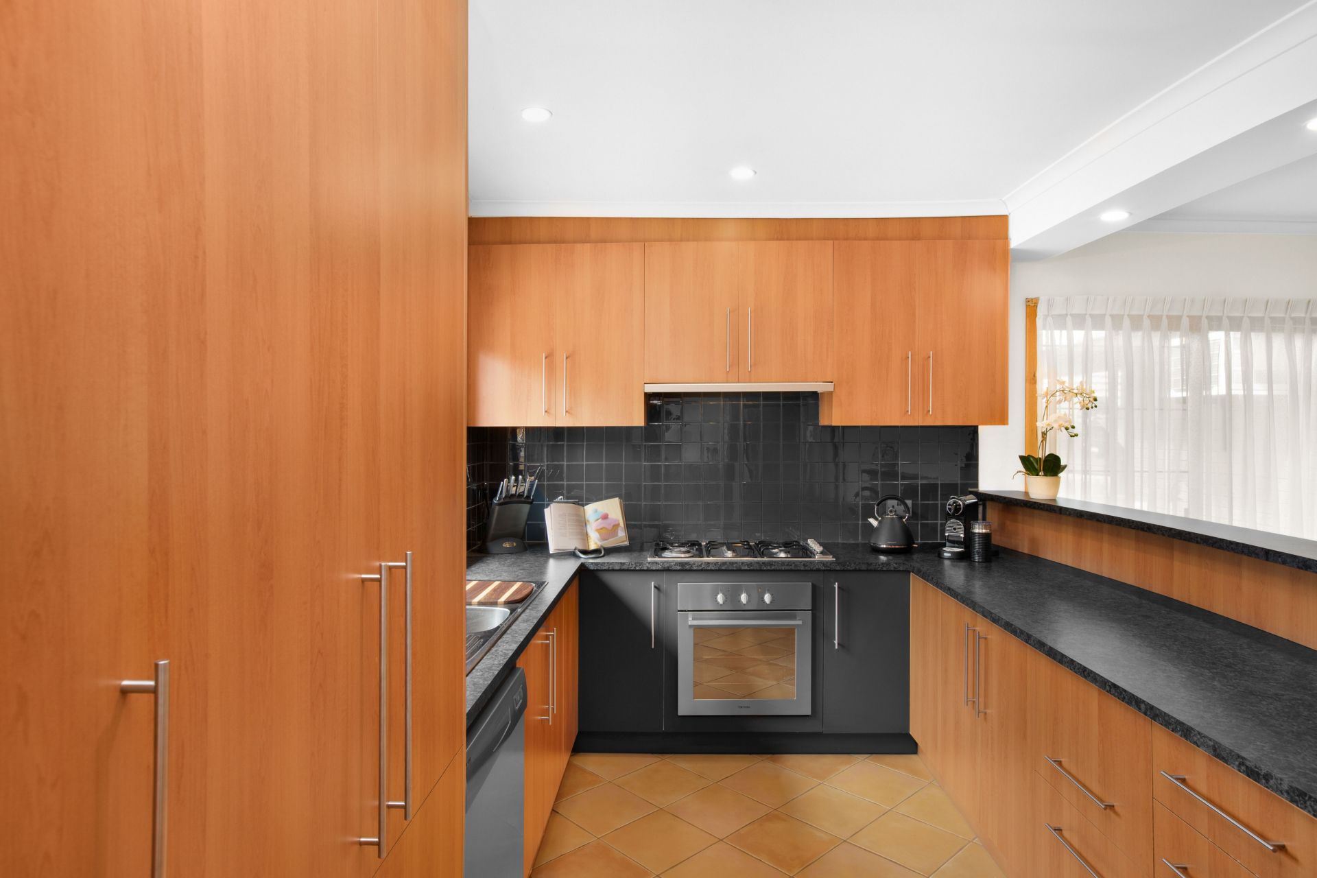 Spacious kitchen, including stainless steel appliances.