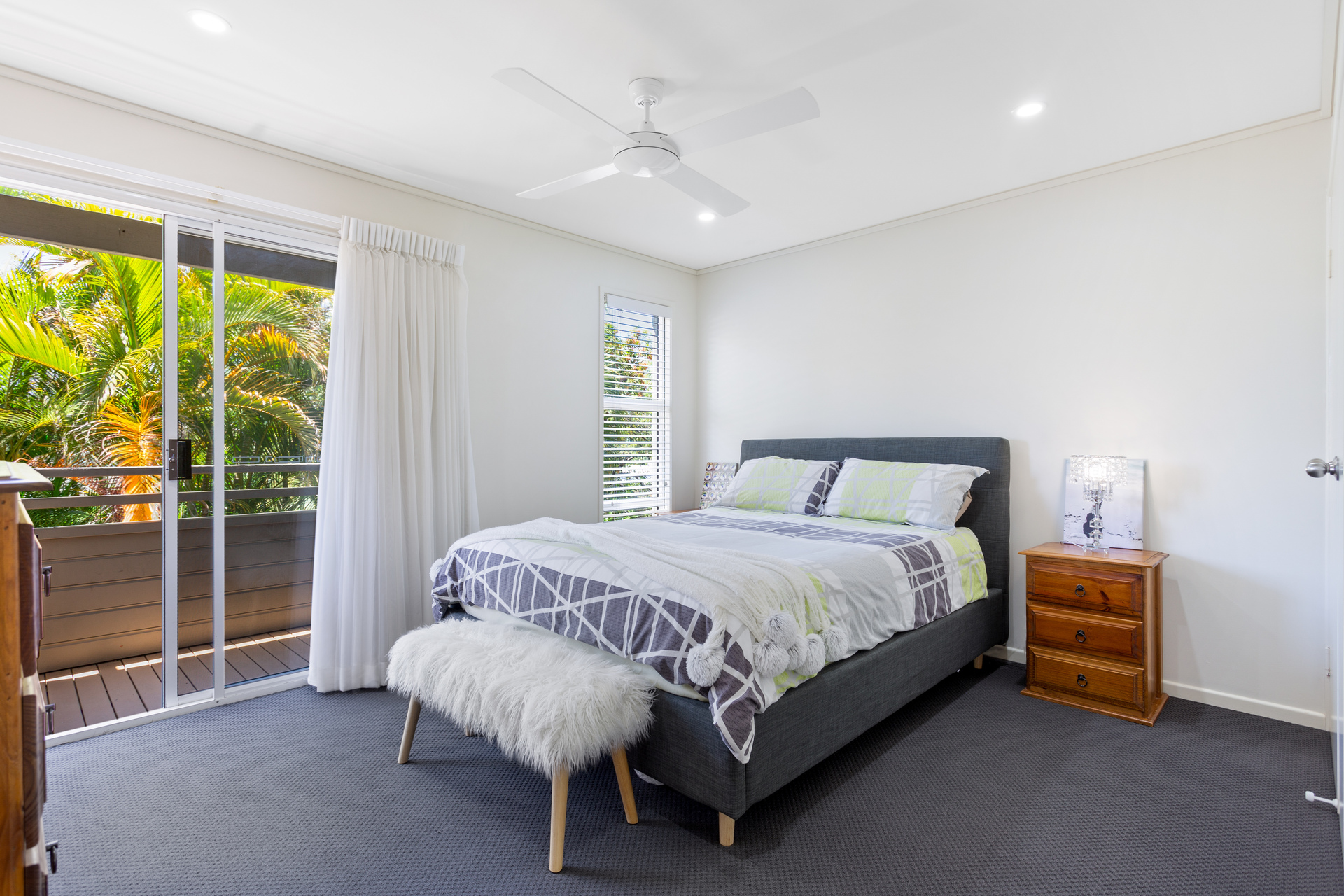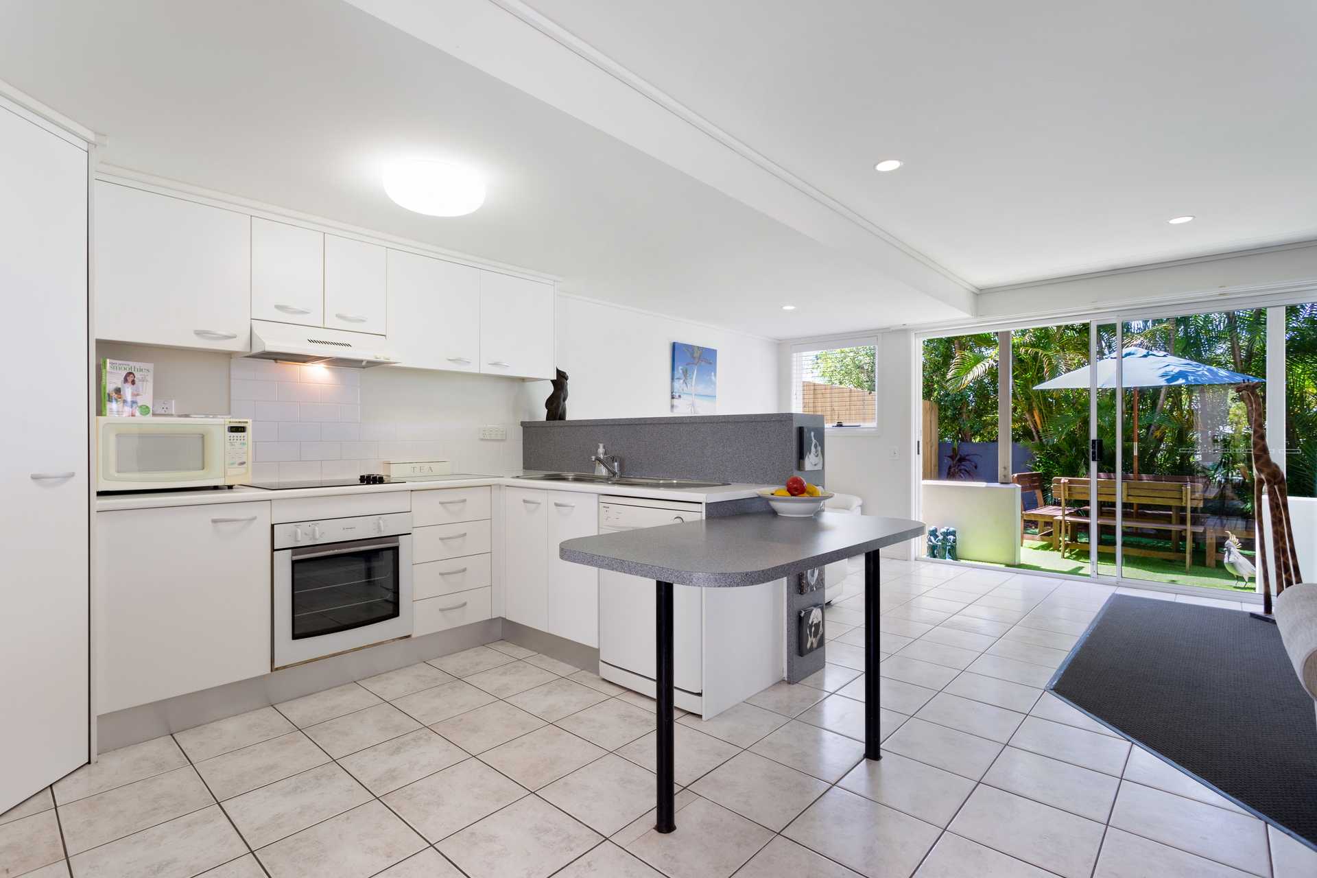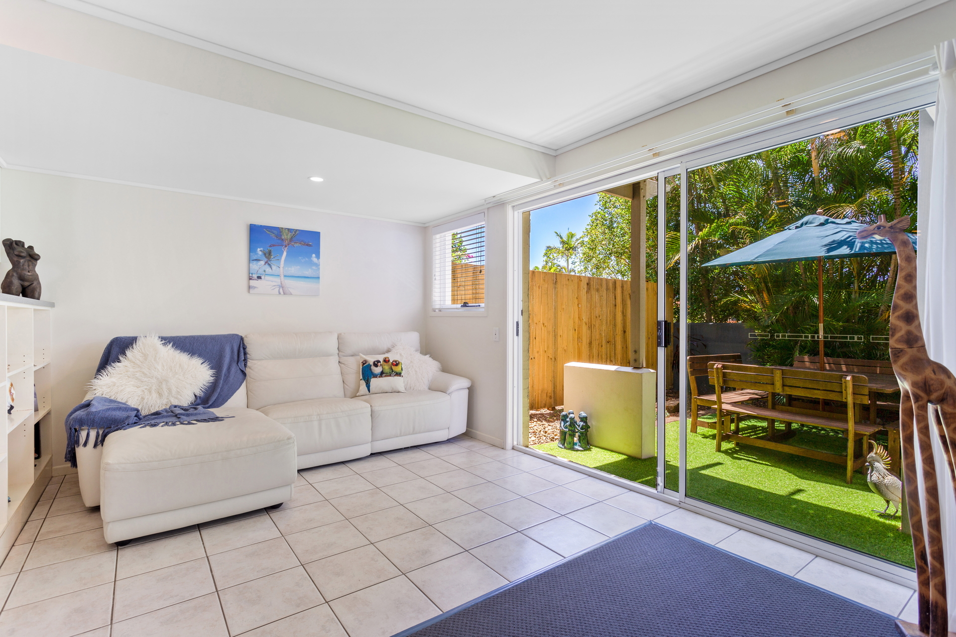 - Living area flows out to a lush, private backyard.