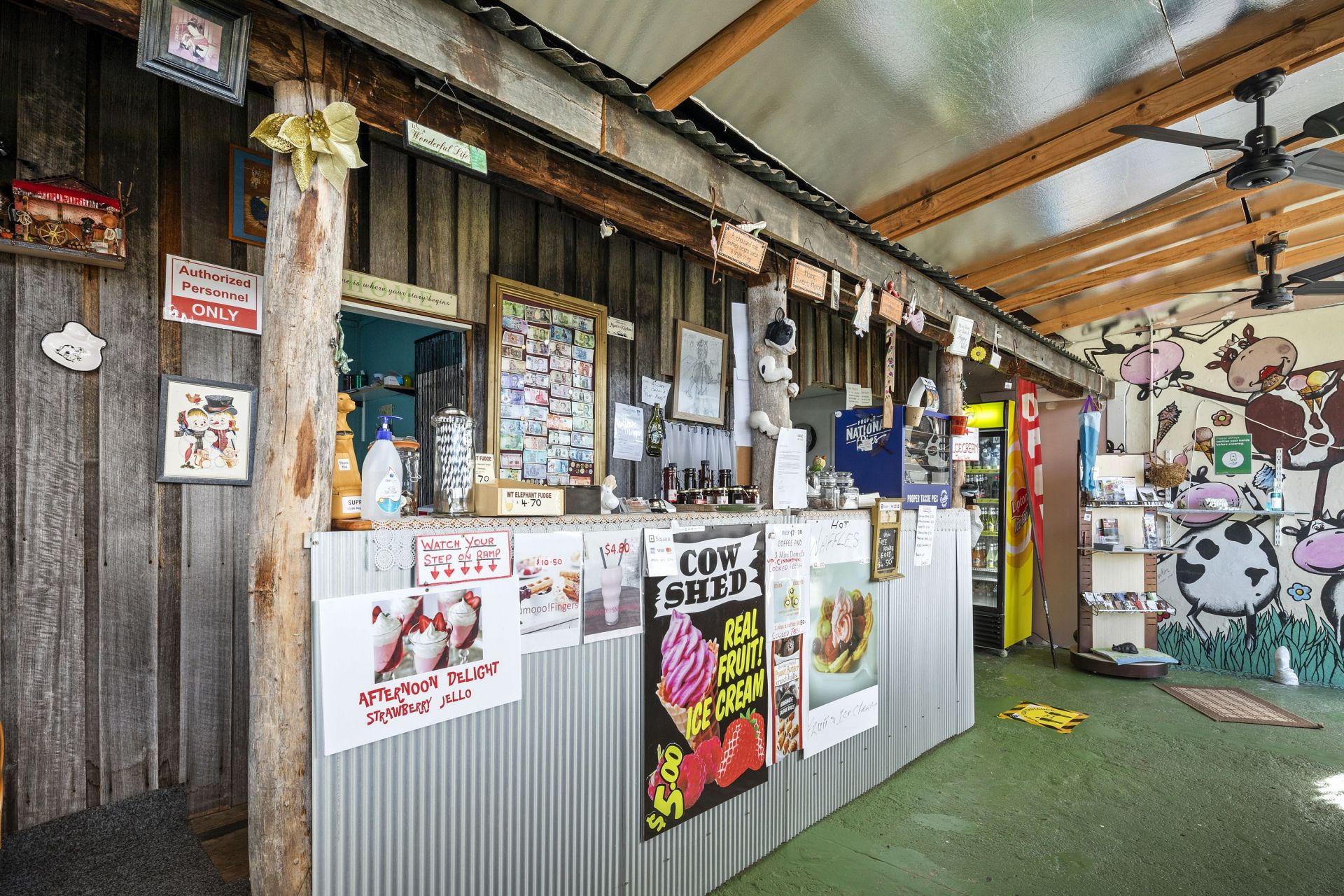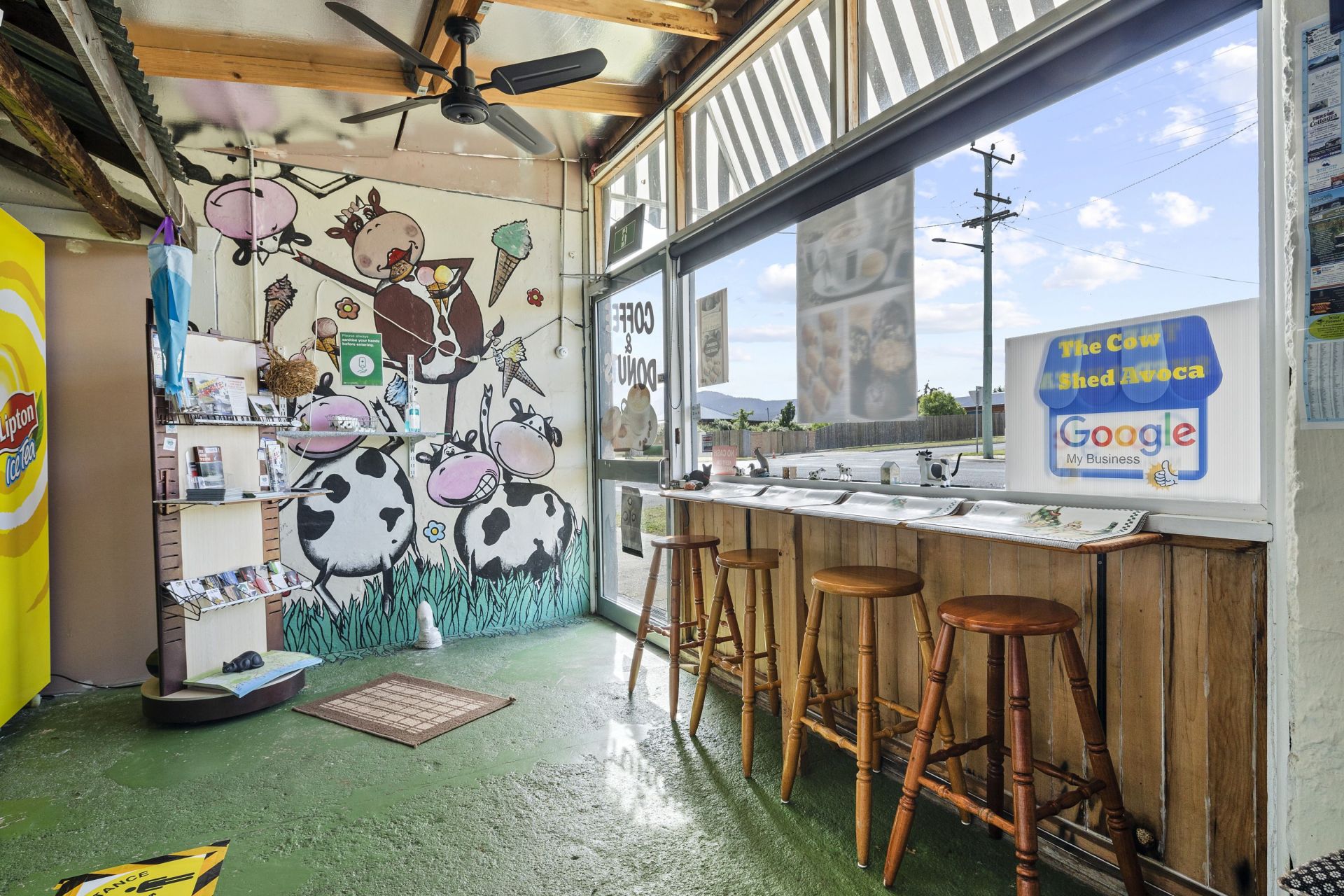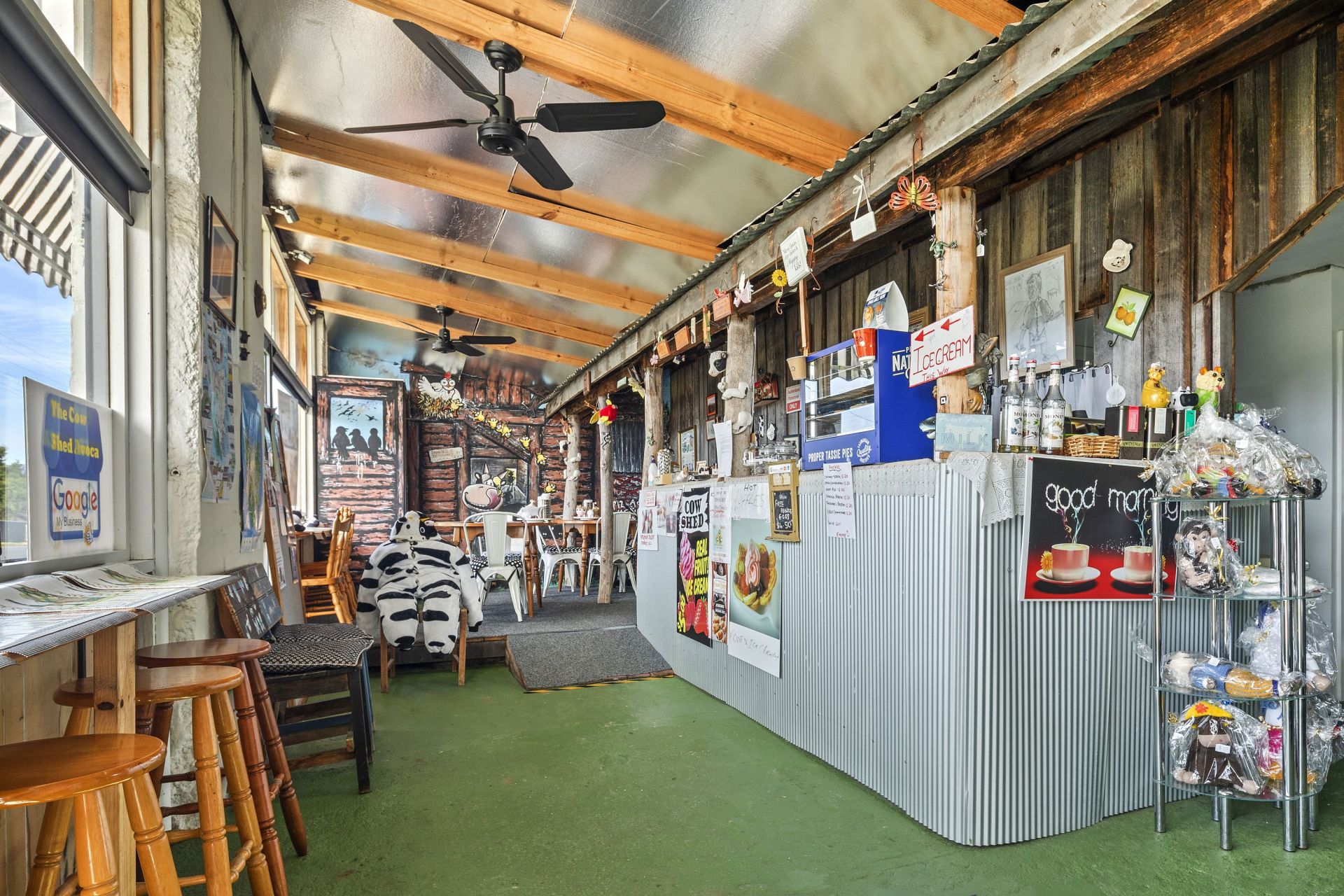 At the moment the Cafe is fully operational and trading 5 days per week from 9am till 5.30 pm selling our own specialty home blended real fruit ice cream , waffles with fruit and ice cream Nan's home made sausage rolls , hot coffees , home baked donuts ,cold drinks , pies pasties, etc eat in or take away.