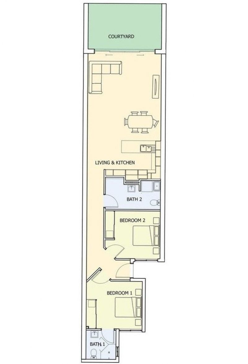 The apartment is located on the ground floor and has a private courtyard, including bench tops and dishwasher in the kitchen, easy to maintain tiles throughout the property and quality fixtures and fittings. Both bedrooms are air-conditioned, as is the open plan living and dining area which can be extended by opening the double sliding doors onto the courtyard.