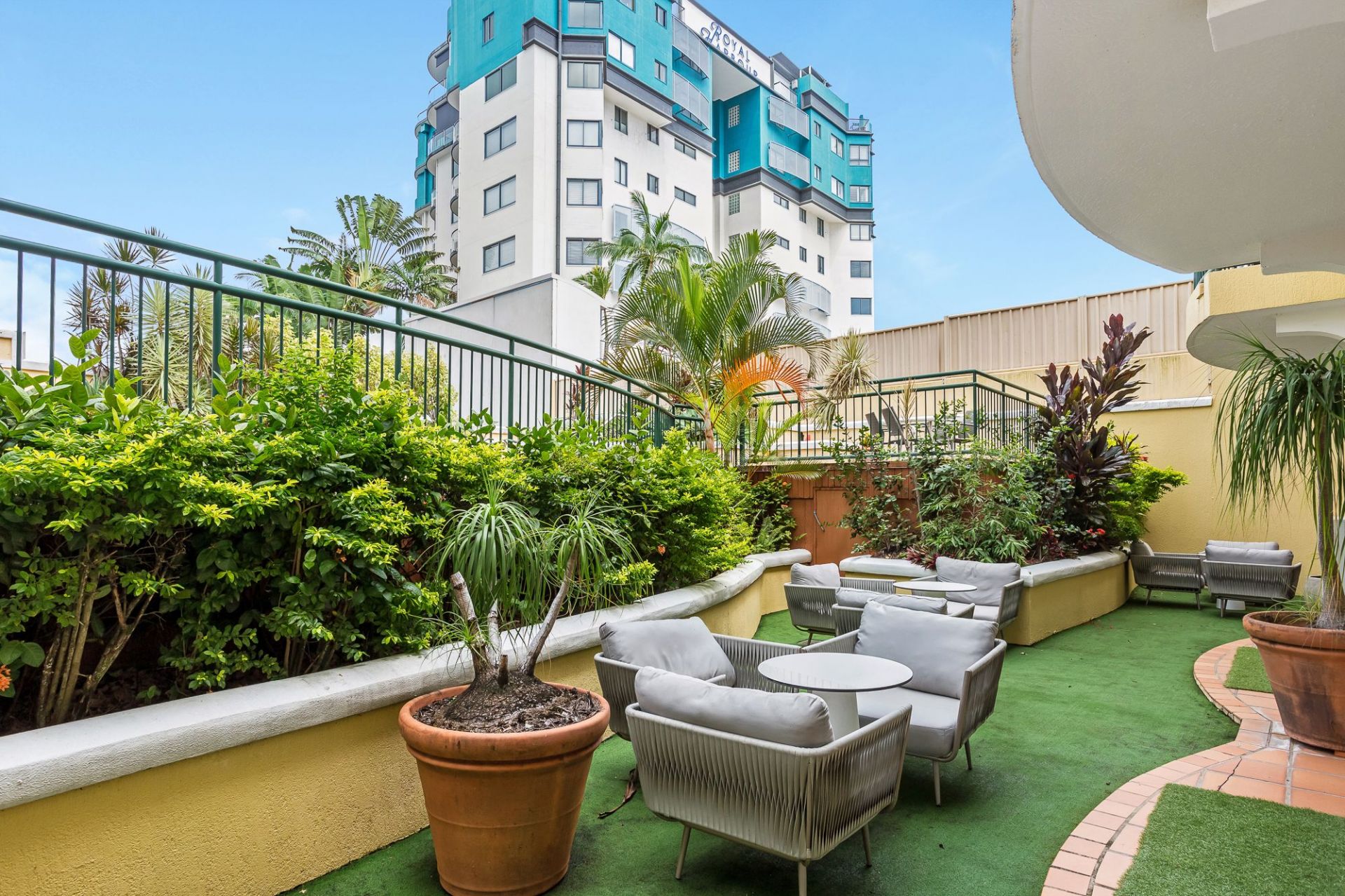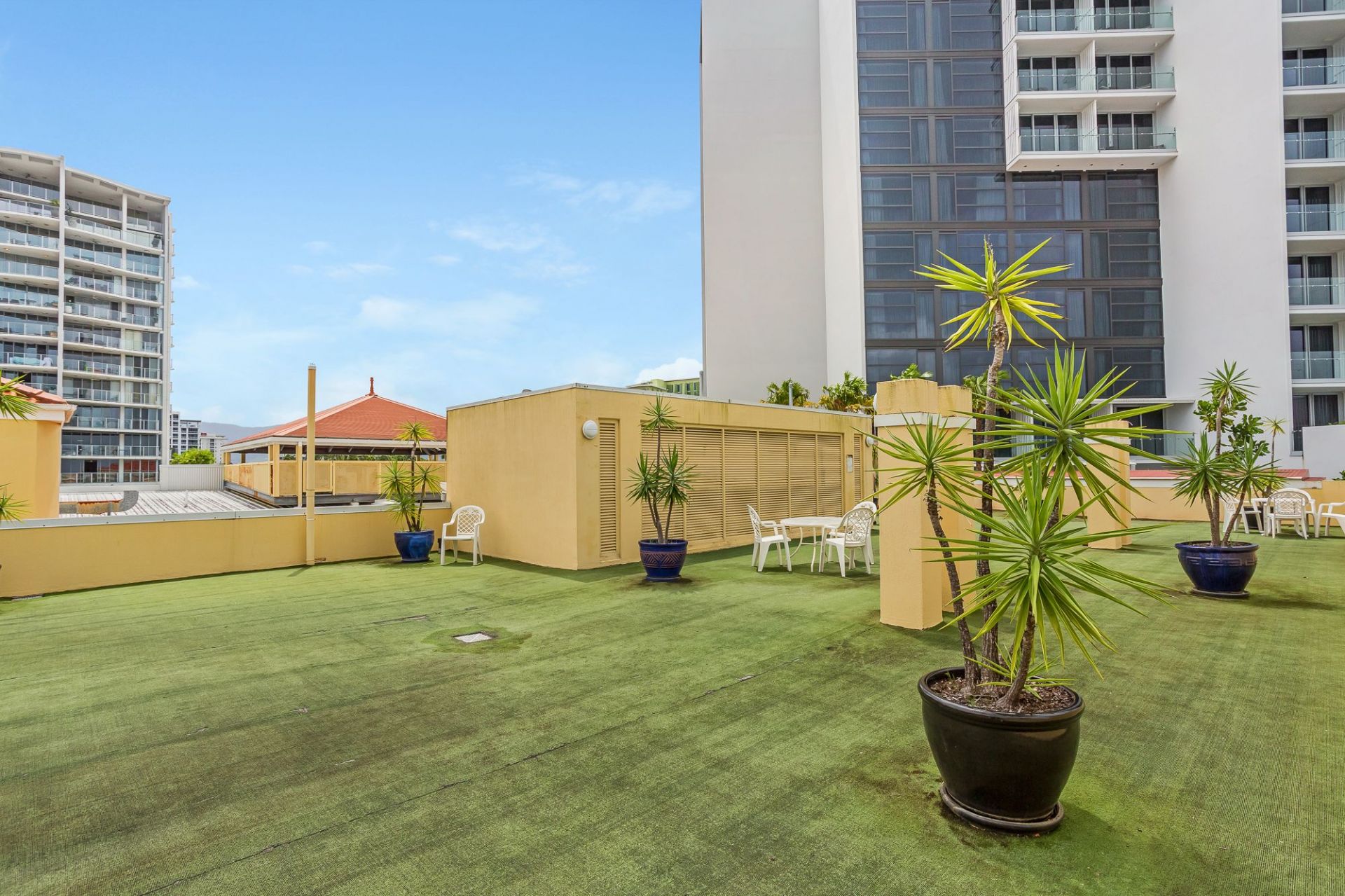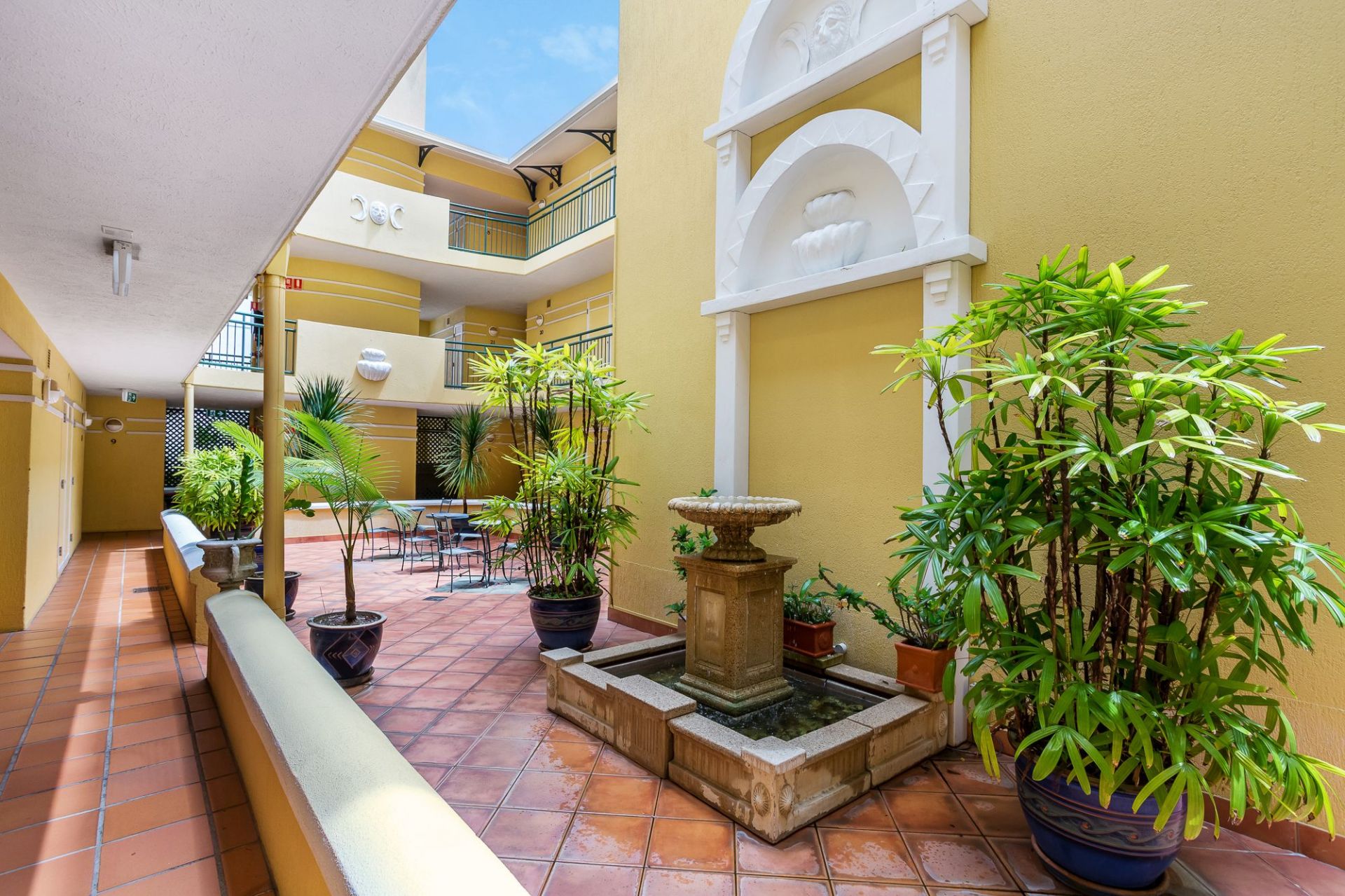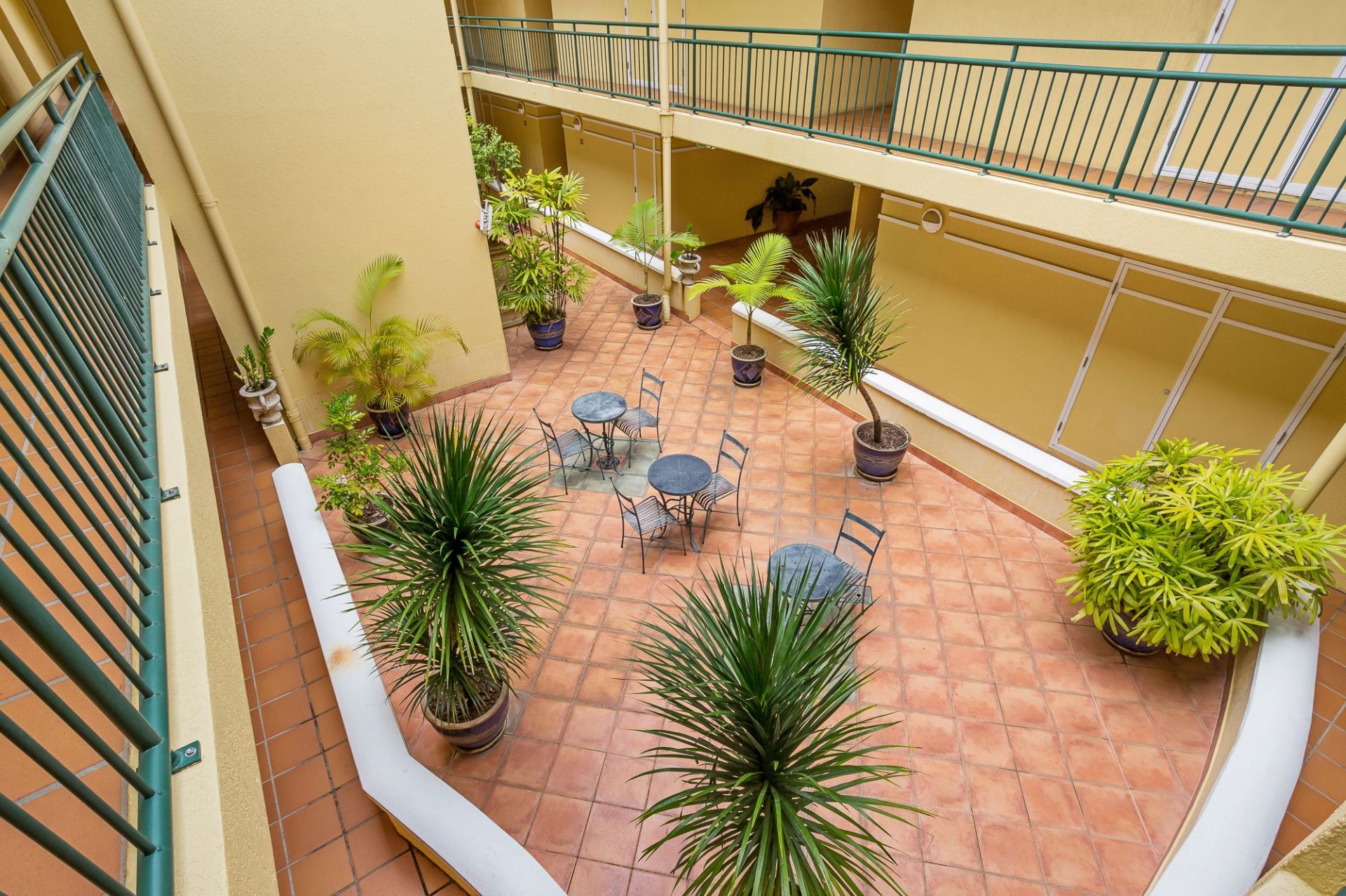 - The complex offers a central courtyard and rooftop sundeck