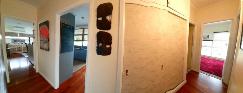 Upstairs - 3 bedrooms, generous bathroom, open living lounge & dining, large kitchen with beautiful polished hardwood floors opening on to a very large full width 10 x 3 entertaining deck, capturing every sea breeze.