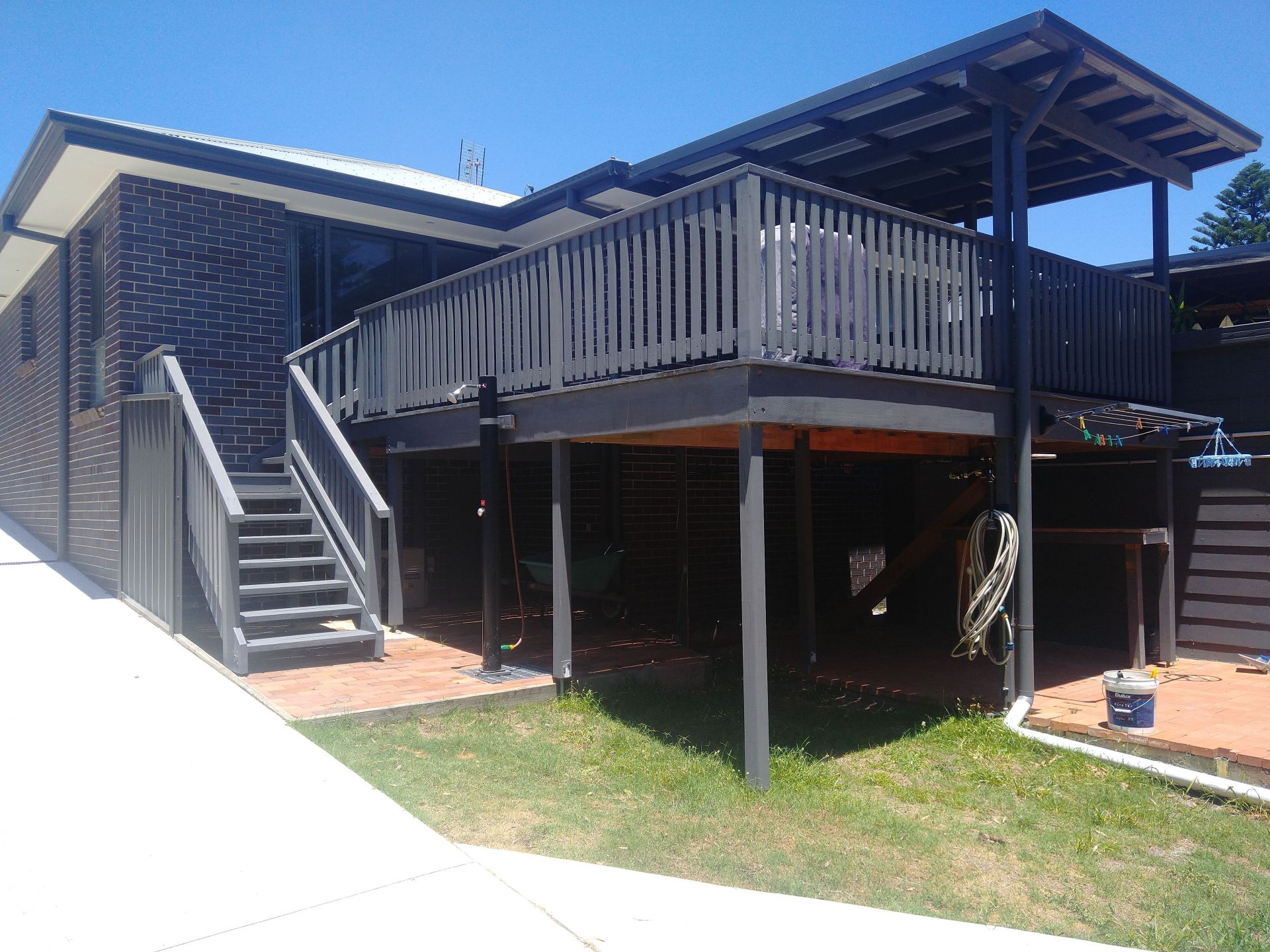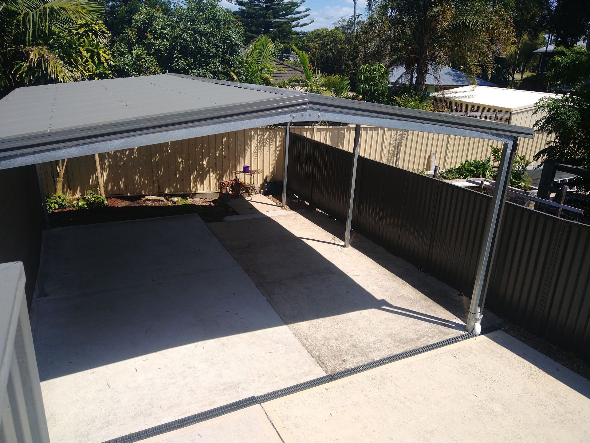 Underdeck head height working area, beach style outside shower, and 6 x 7 double carport high enough for caravan or large boat.