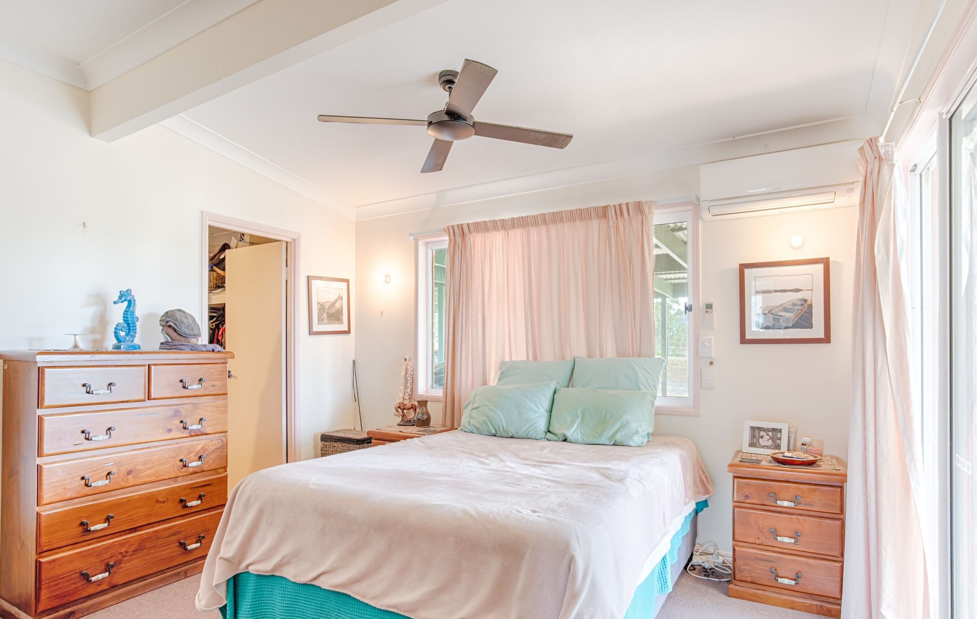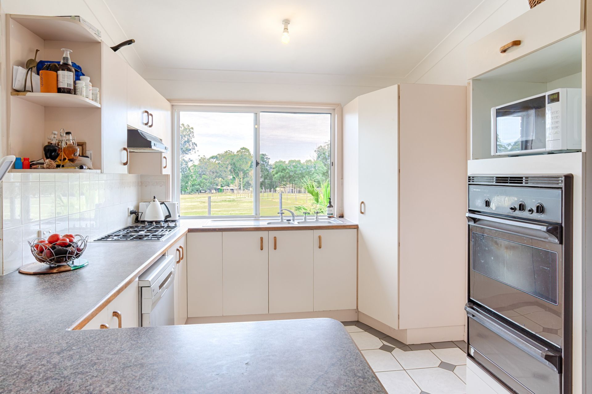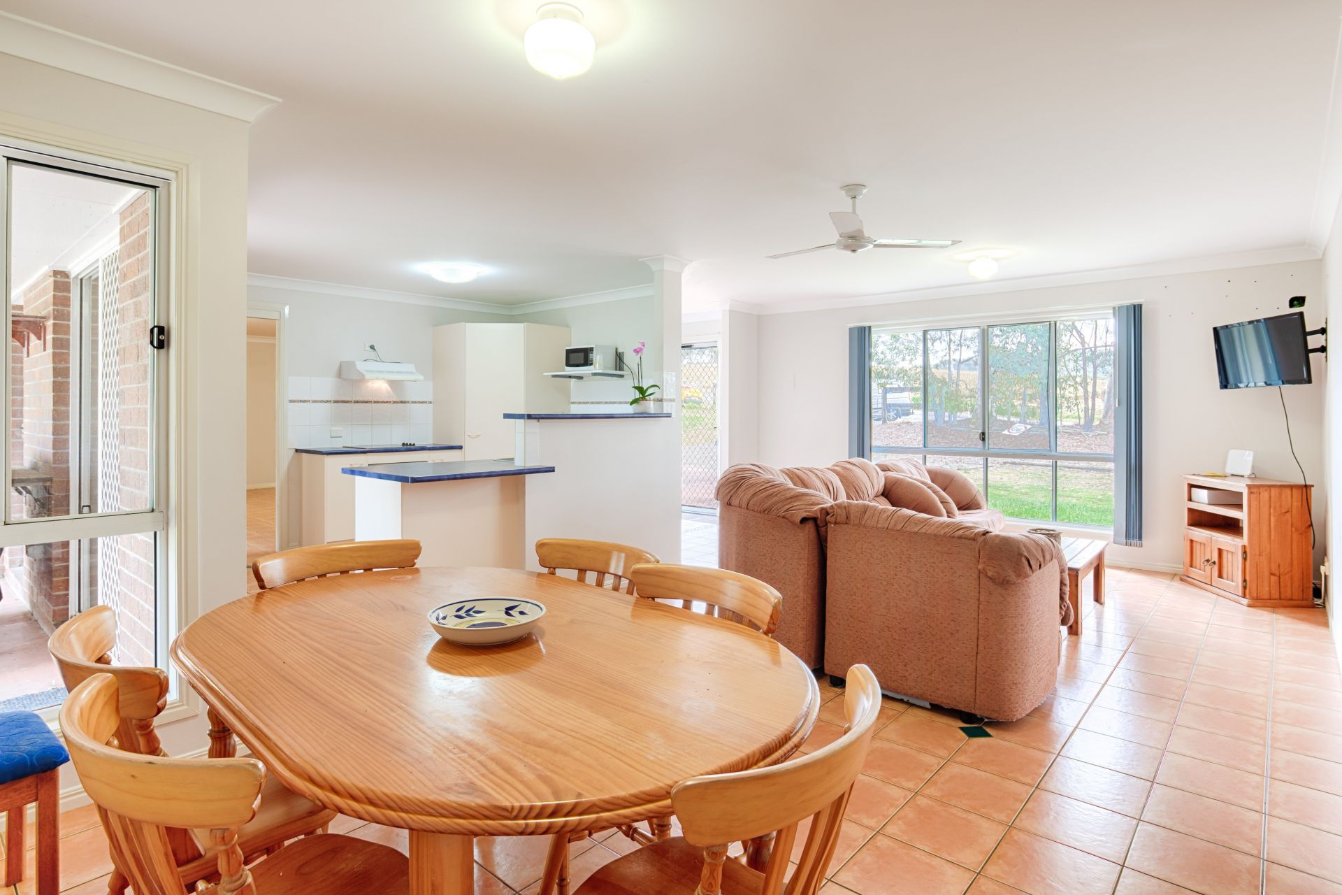House 2: L-Shaped Brick veneer, 4 bed 2 bath, reverse cycle air conditioning, ceiling fans throughout, double garage, rear covered patio, large family home serviced by 44,000 L rainwater tanks, leafy shaded yard with dog-proof fence, chook pen and 2 adjoining horse paddocks 4 acres for use by past-tenants.
