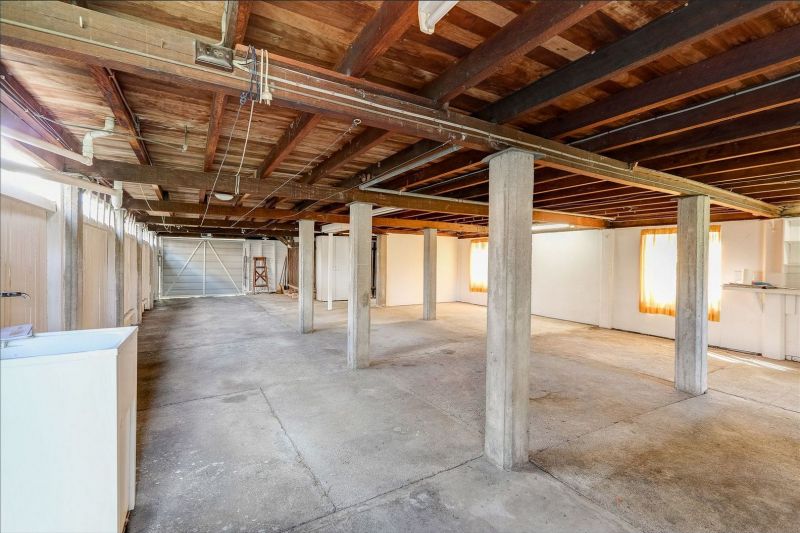 - Large under house storage area with laundry, workshop, and tandem parking with electric garage door