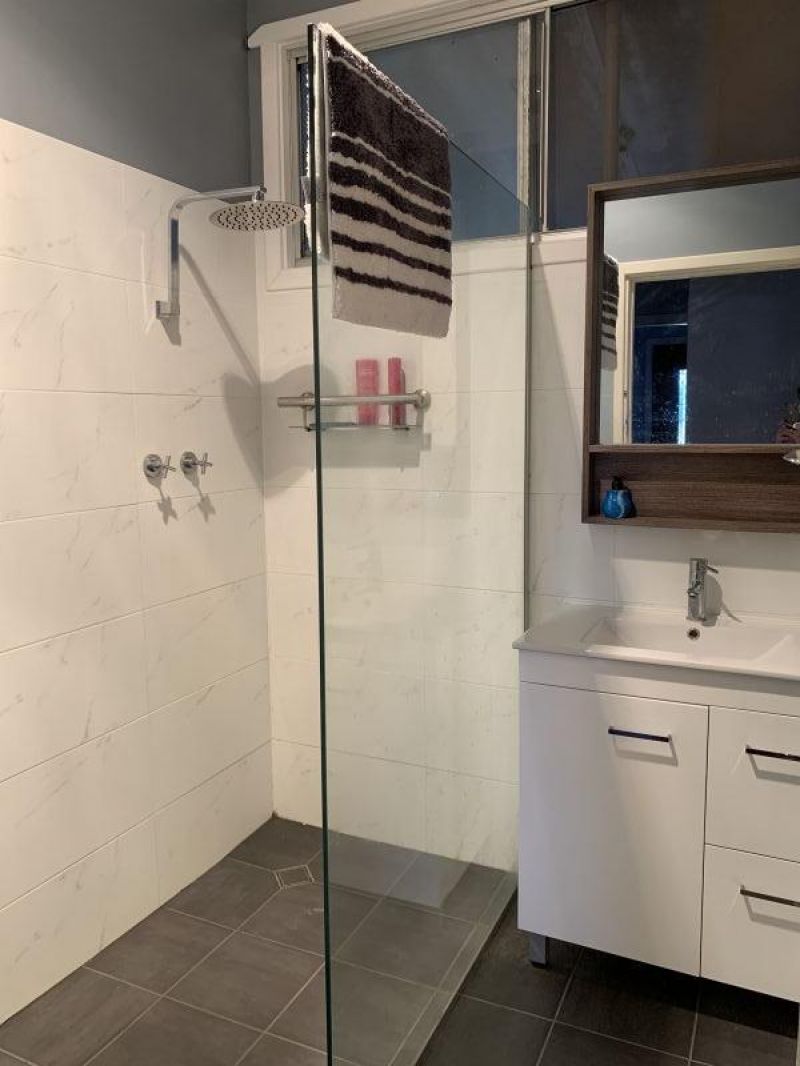 The hallways leads to a newly renovated bathroom with stunning glass shower screen and large shower head.