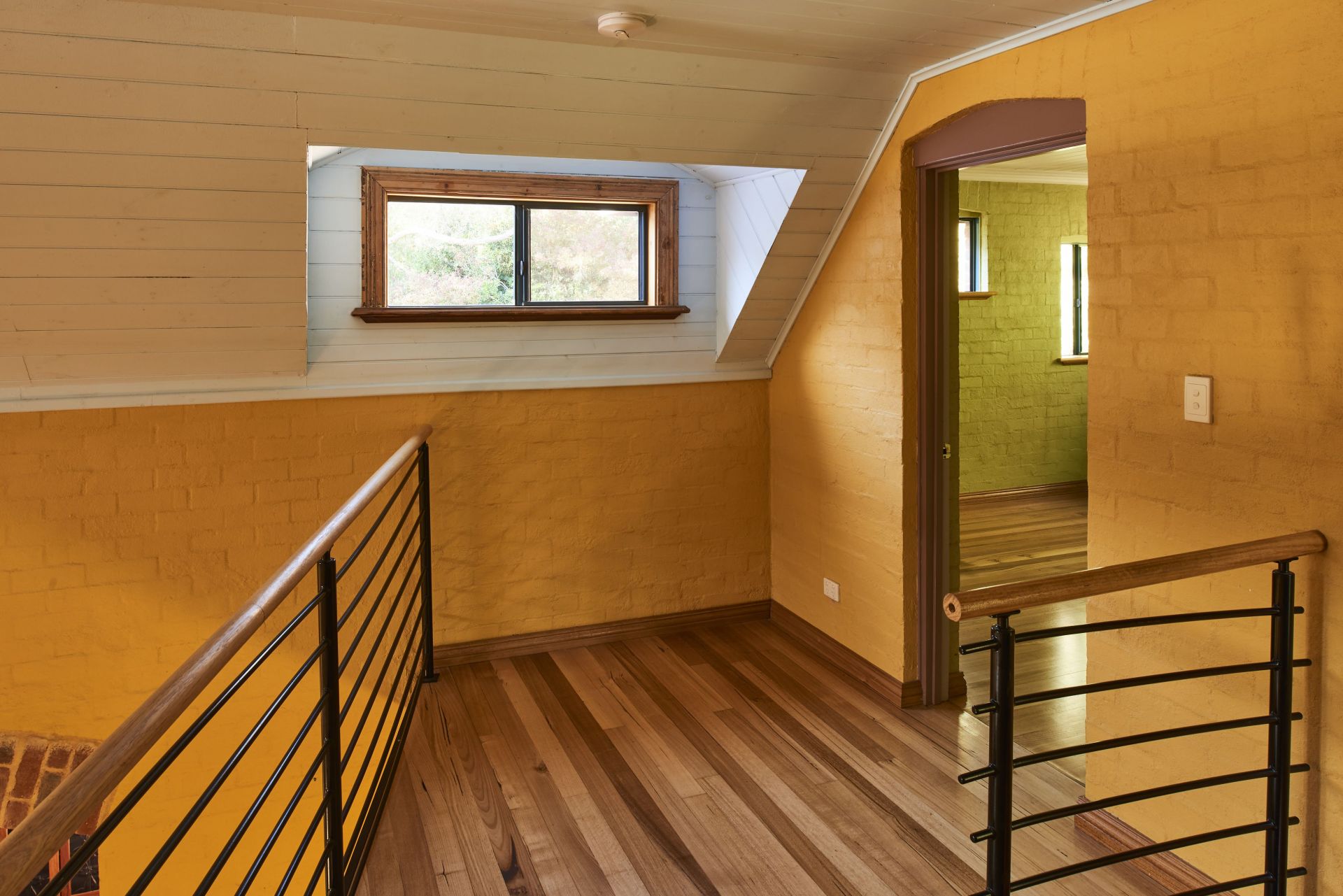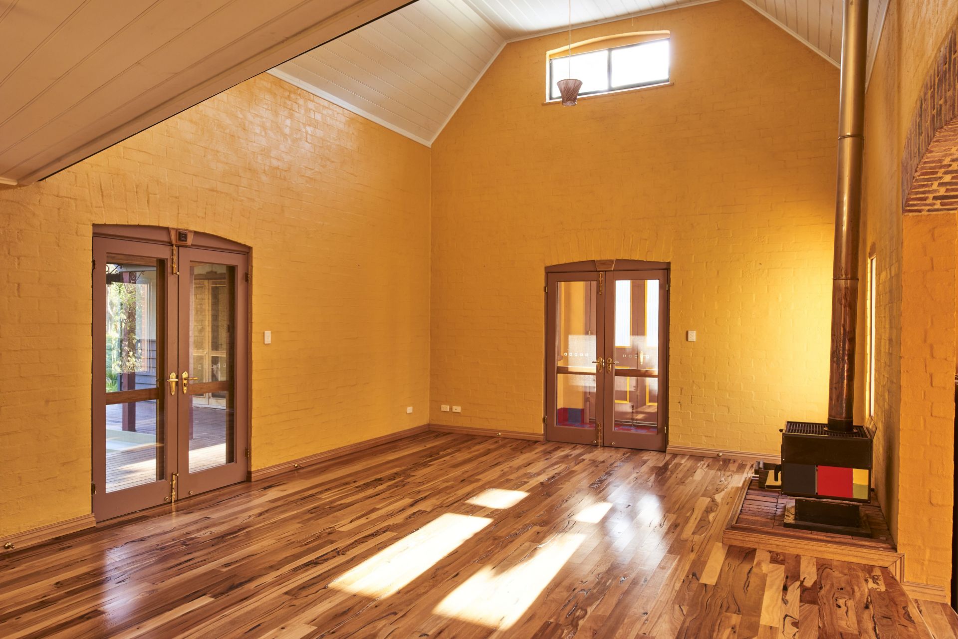 A vestibule entry invites you into the large open living space with soaring timber ceilings and a beautiful red gum floor. Underfloor and ceiling insulation ensures this room stays at a comfortable temperature year round.