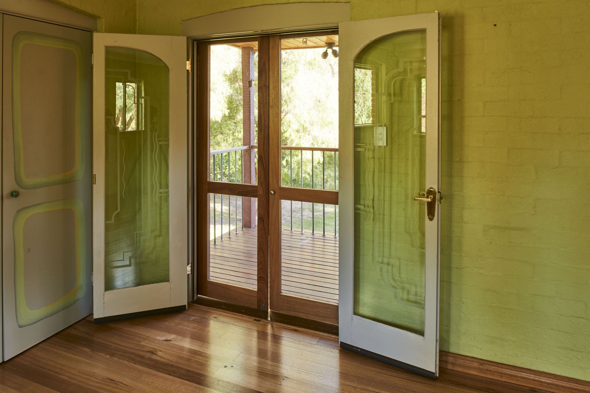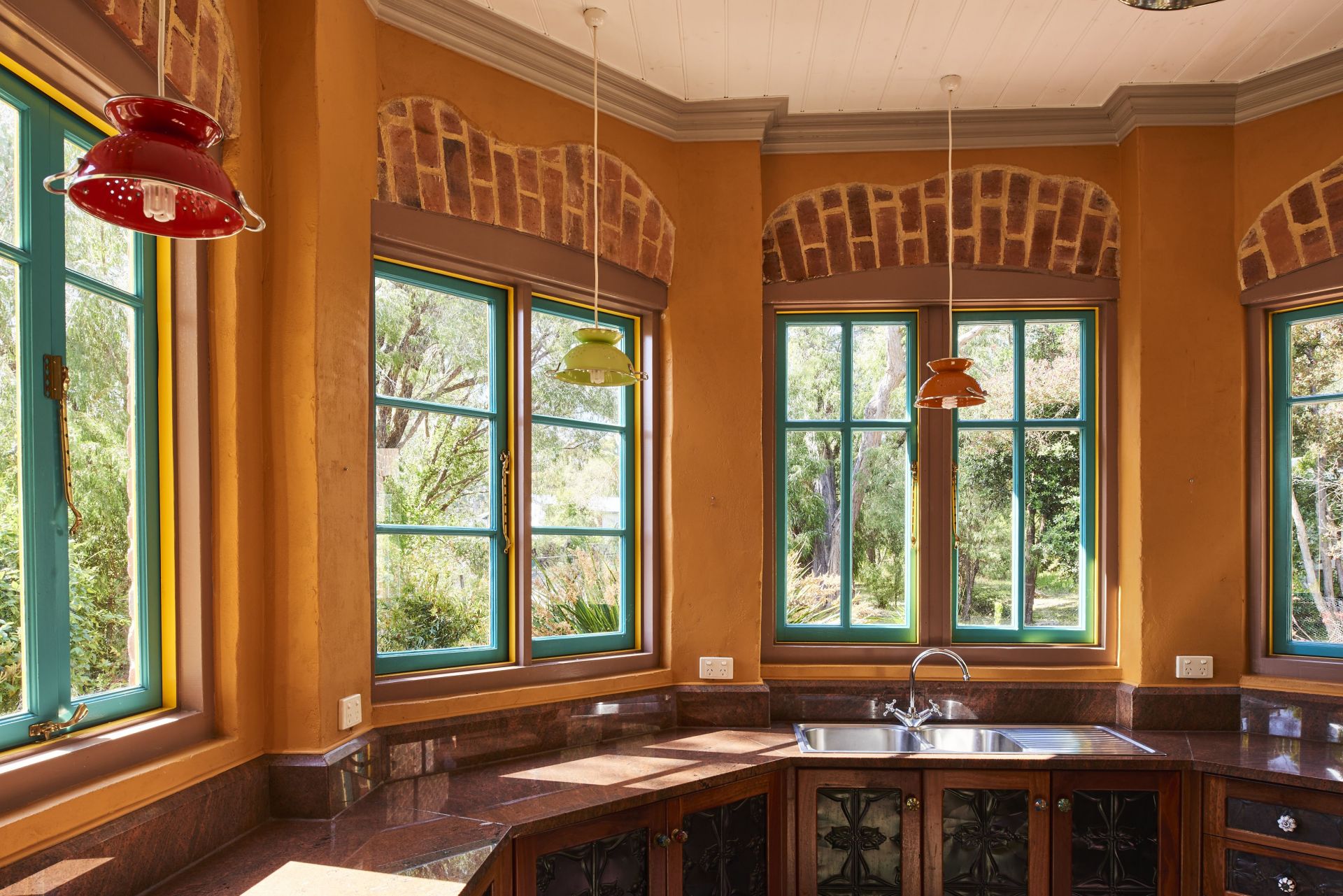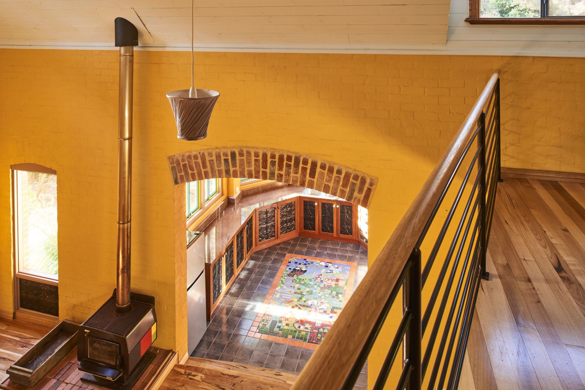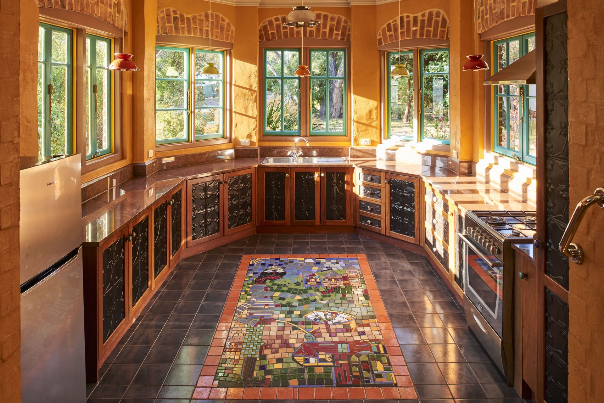 Step down into a dream north facing kitchen with lots of natural light streaming in through timber framed windows. It features granite benchtops, antique pressed tin and jarrah cupboard doors, underfloor heating and ample storage. A mosaic centerpiece by a NZ artist is embedded into the floor. Creative arches and timber treatments frame the kitchen.