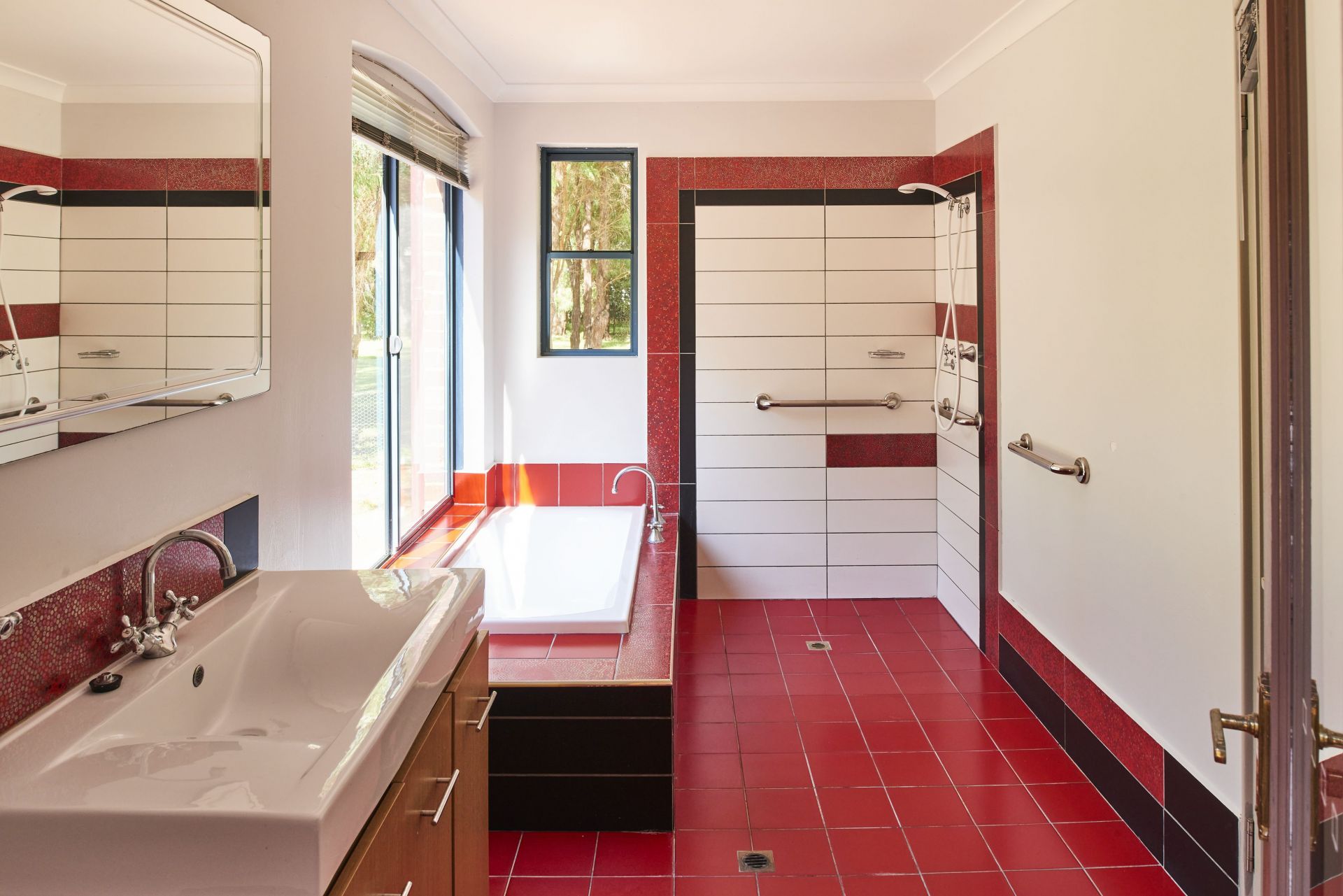 The north facing bathroom is bathed in light has a large bath and separate shower. Additional door to outside ensures easy access from the reticulated gardens, planted with local flowering natives