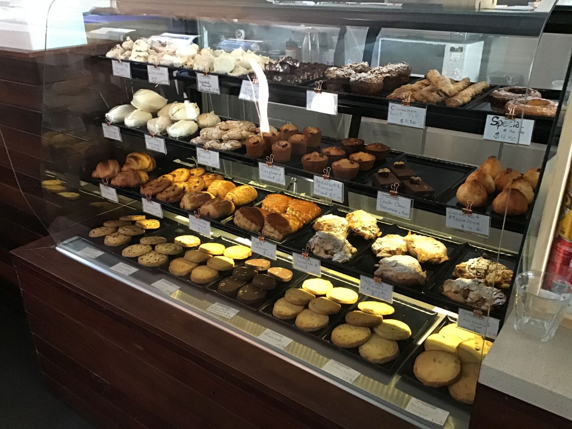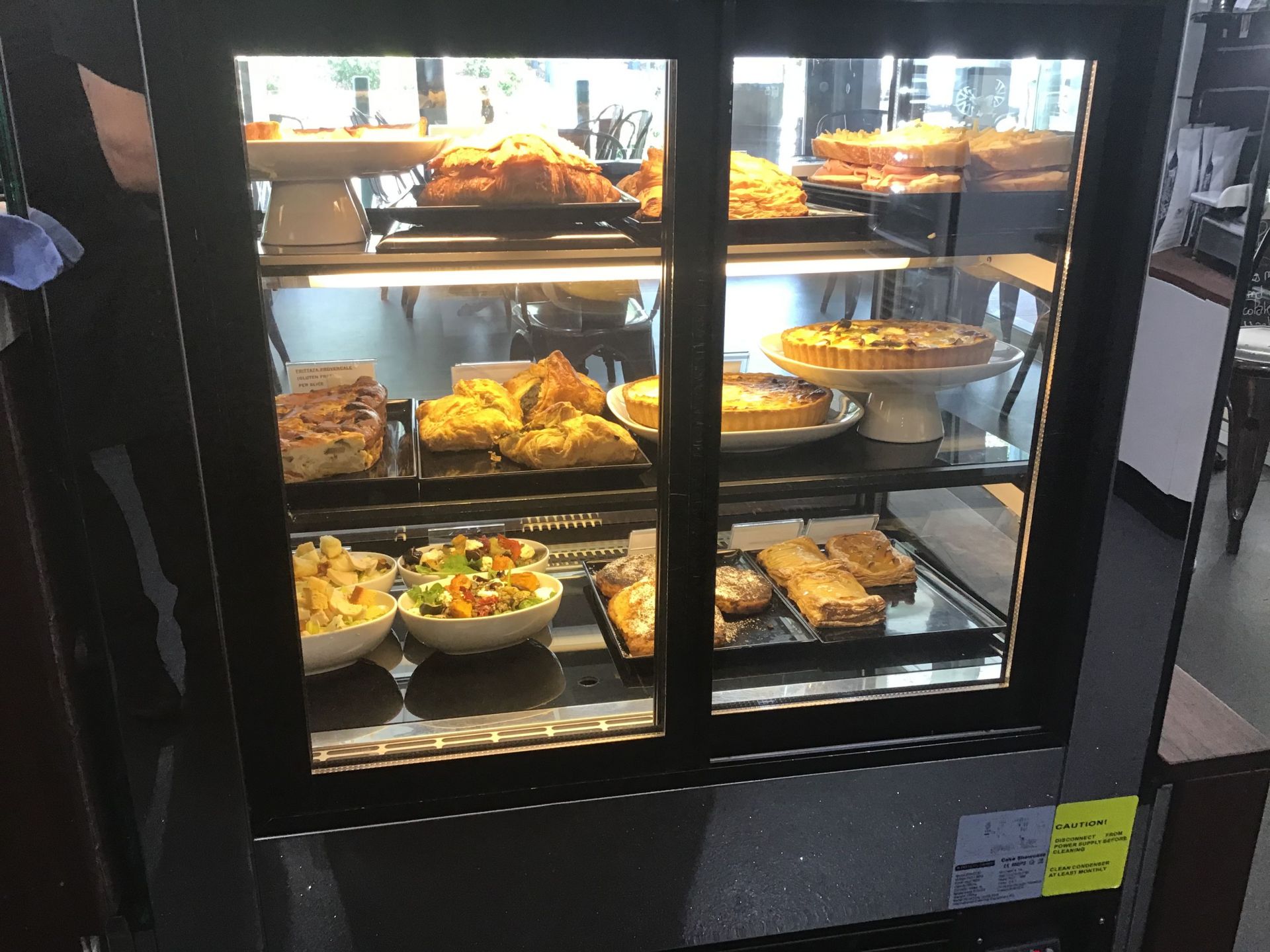 The cafe currently sells hand made chocolates (bought in from a Gold Coast family business), standard french pastries and cakes, savoury items (quiches, salads, gluten free items, hot foods, soups, etc…)