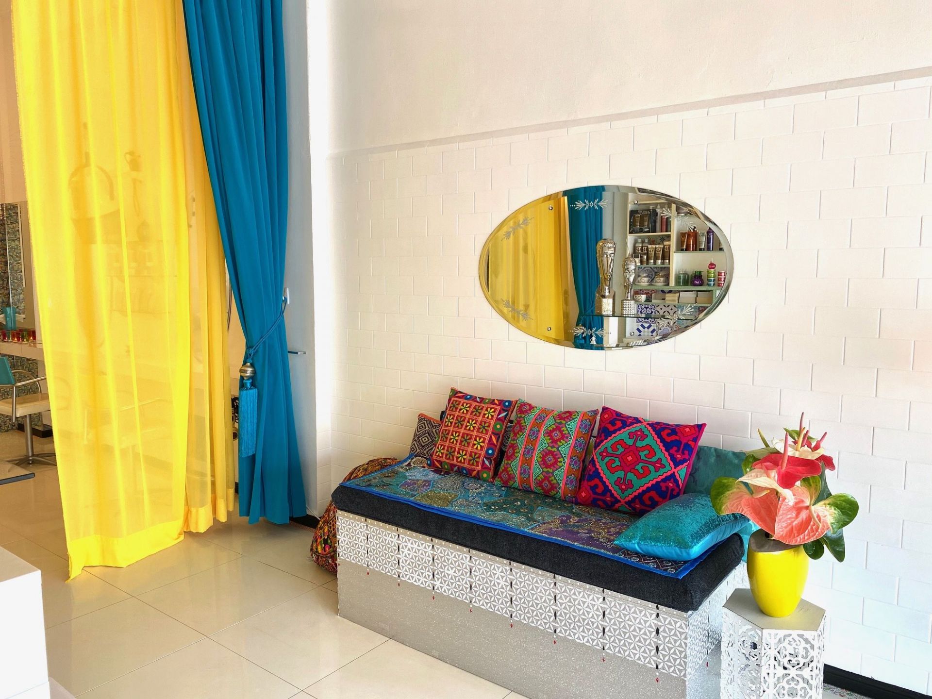 Stunning ceiling to floor glass entrance surrounded by mosaic tile, Italian Maletti Salon Furniture, Moroccan lights, heavy velvet turquoise curtains from the U.S and antique chandeliers and mirrors. Brand new basin units and shelves full of TIGI stock.